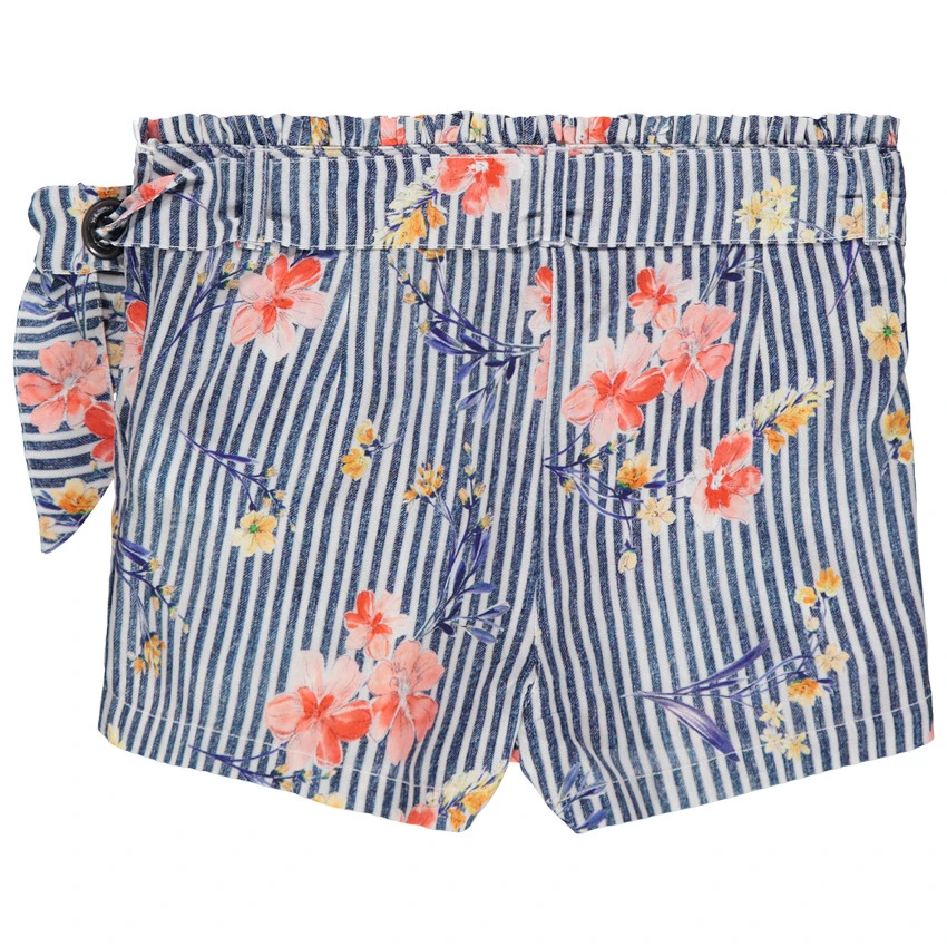 Short à rayures verticales. Taille ajustable de l’intérieur avec ouverture zippée sur le côté. Fleurs imprimées all-over.