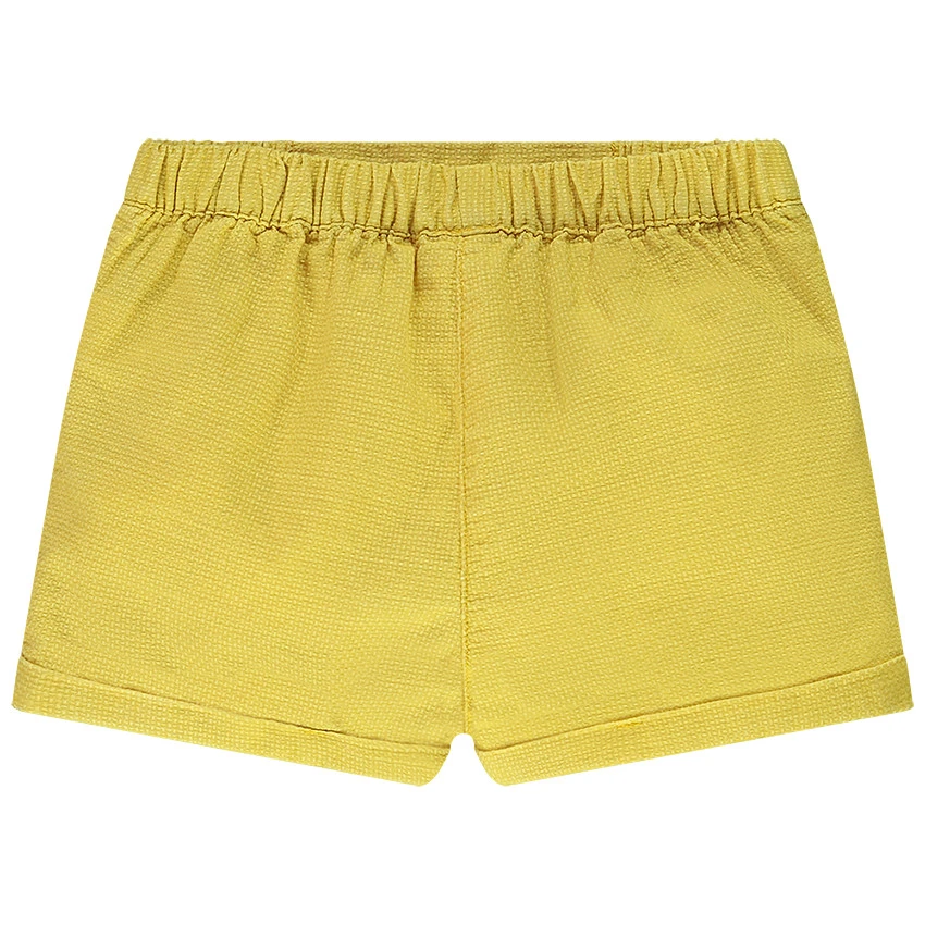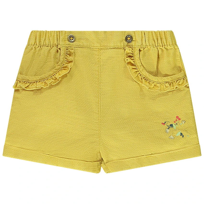 Short avec taille élastiquée. Deux boutons fantaisie au niveau de la taille. Deux poches cavalières avec finitions volantées sur le devant. Print petit oiseau en bas du short. Effet gaufré ton sur ton all-over.
