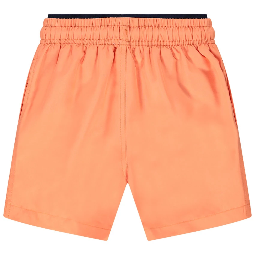 Short de bain orange. Doublure. Ceinture jacquard. Print planche de surf et inscription. Taille élastiquée. Cordon de serrage.
