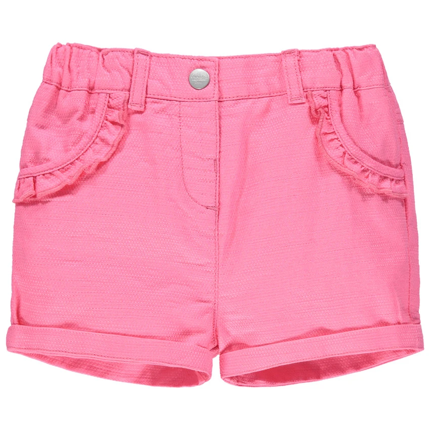 Short en maille. Taille ajustable de l’intérieur par élastique et boutons. Ceinture à passants avec bouton et découpe braguette. 2 poches cavalières avec volant. 1 poche plaquée au dos.