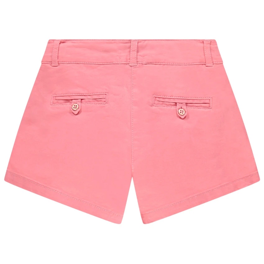 Short en satin de coton uni. Taille ajustable de l’intérieur par élastique et boutons. Ceinture à passants avec ouverture boutonnée. 2 poches cavalières à volant. 2 poches passepoilées au dos.