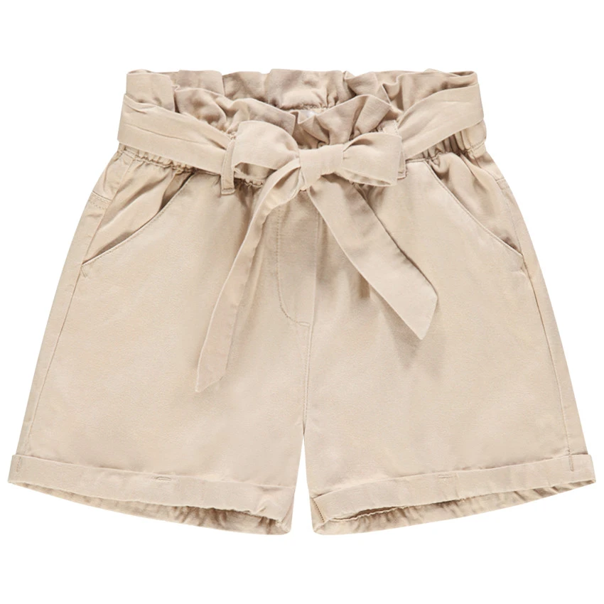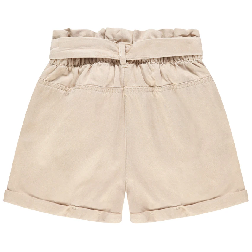 Short en toile beige. Taille haute Ă©lastiquĂ©e Ă passants. Ceinture Ă nouer. 2 poches coupĂ©es devant. Revers fixes.Â