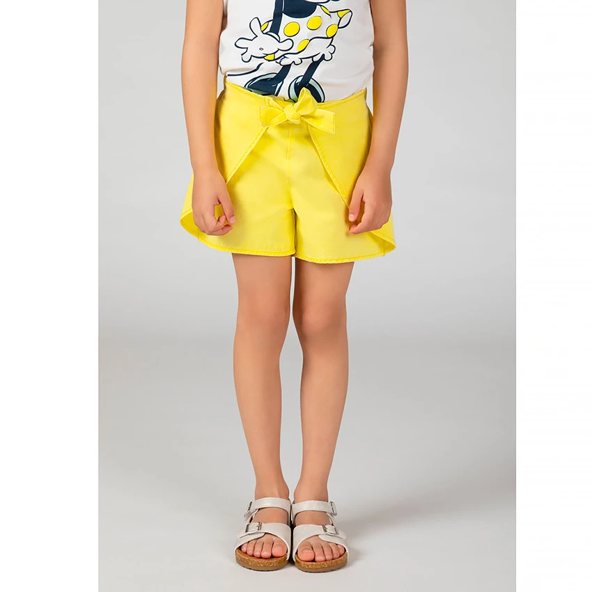 Short fluide jaune. Pans fantaisie sur les côtés. Liens à nouer sur le devant. Taille élastiquée.