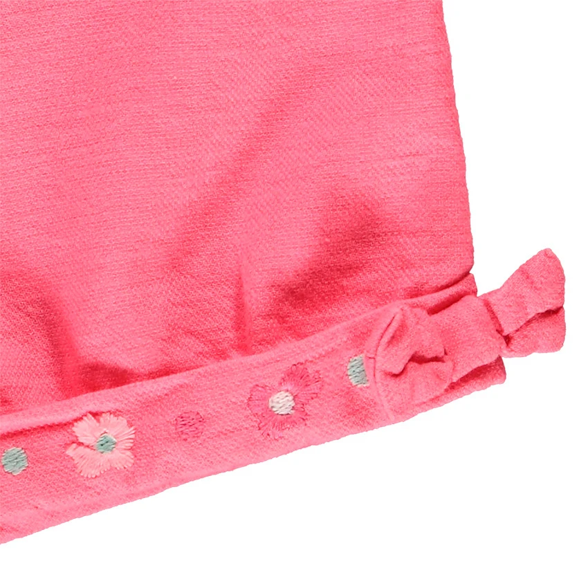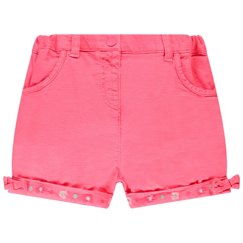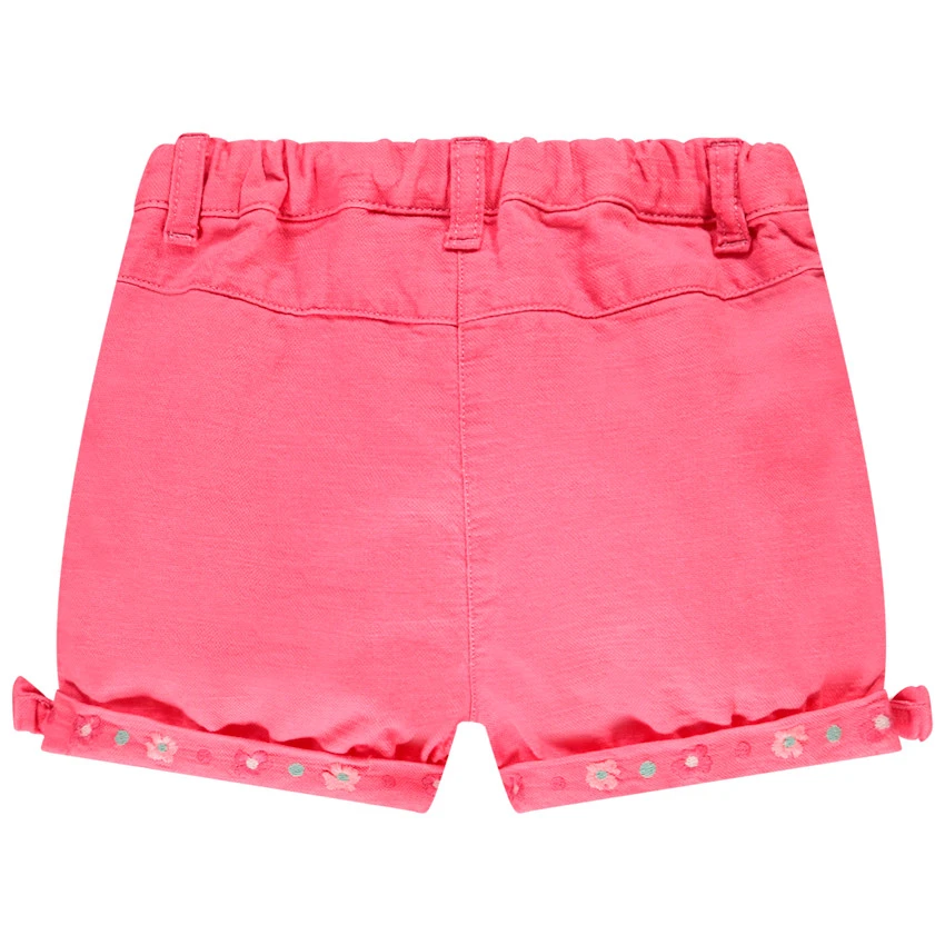 Short rose. Taille ajustable. Revers avec broderies de fleurs de couleurs. Petit noeud rose sur les côtés extérieurs des revers.