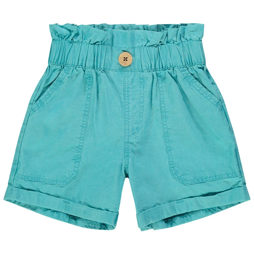 Short taille haute élastiquée. Bouton effet coco sur le devant. 2 poches cavaliÚres devant. Revers fixes. 2 poches plaquées au dos.