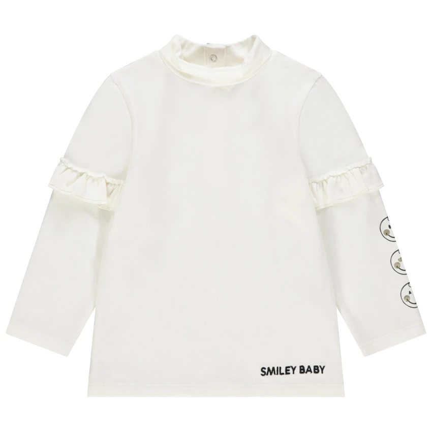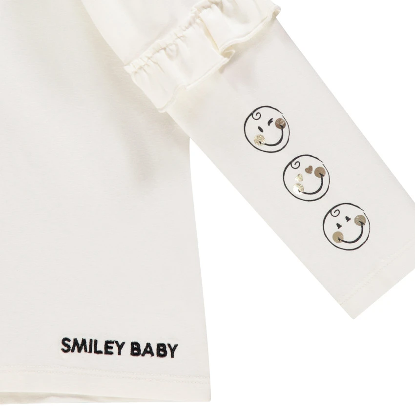 Sous-pull uni. Col cheminée. Volants sur les manches. Smiley printés avec foil argenté sur la manche. Texte Smiley brodé sur le bas. Ouverture pressionnée au dos.