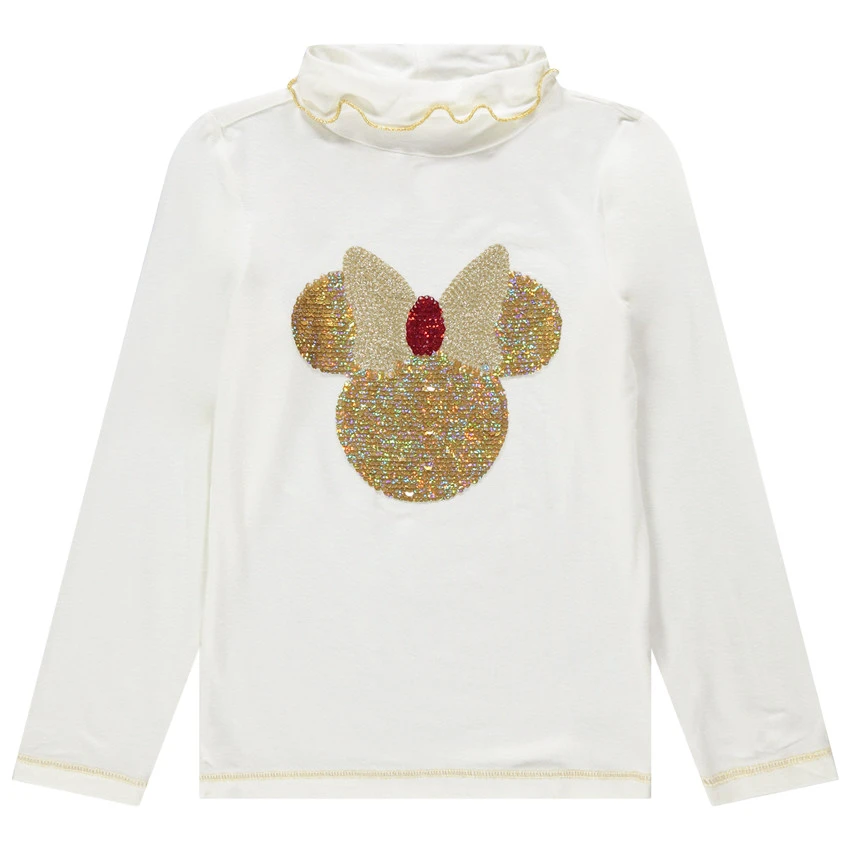 Sous-pull en jersey. Col roulé ondulé finition dorée. Minnie en sequins magiques iridescents.