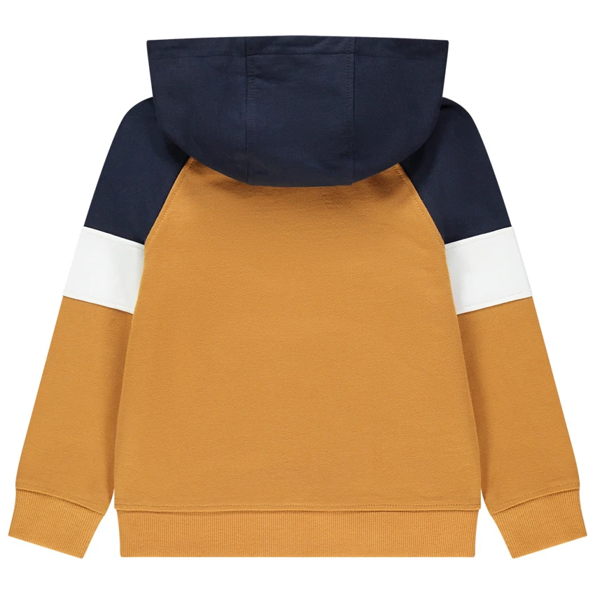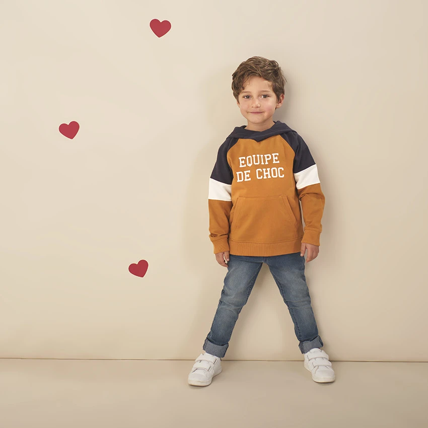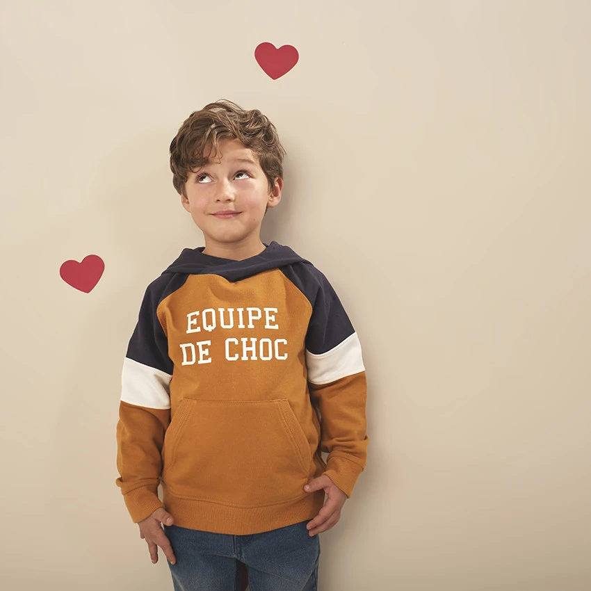 Sweat à capuche en molleton bicolore. Bandes contrastées sur les manches. Message printé devant. 1 poche kangourou sur le devant. Poignets et base en bord-côte.