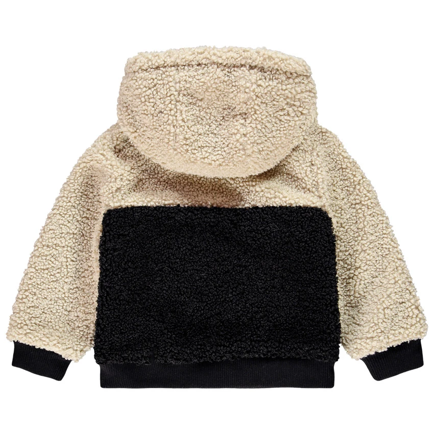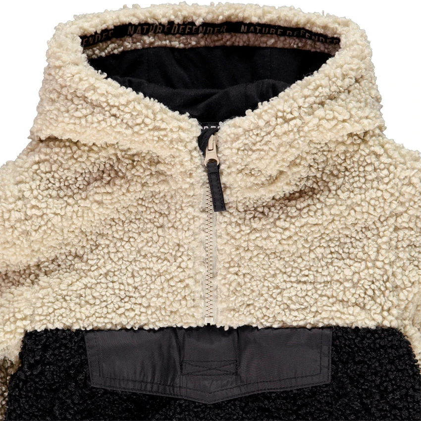 Sweat à capuche en sherpa moutonnée bicolore. Col zippé. Poche kangourou sur le devant avec rabat à scratch. Petite étiquette brodée sur le devant.