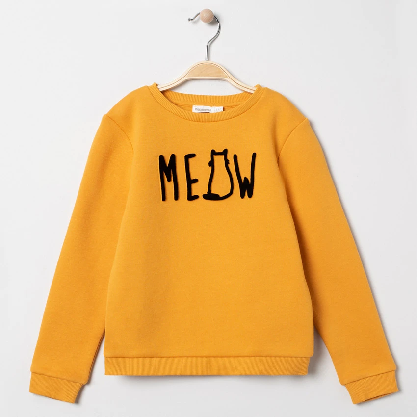 Pull en molleton jaune. Encolure ronde en bord-côte. Inscription en relief sur le devant. Poignets et base en bord-côte. Dos uni.