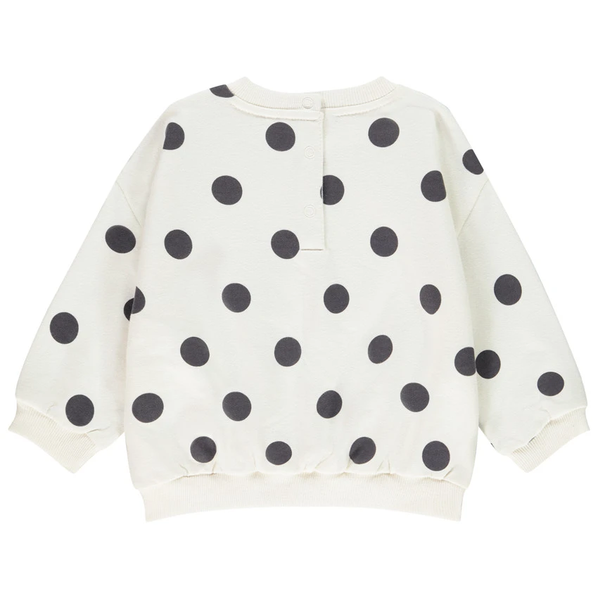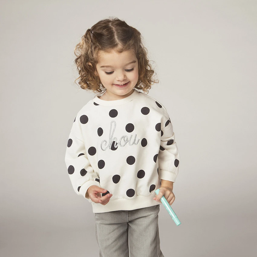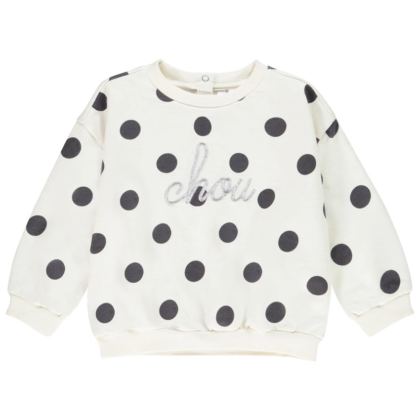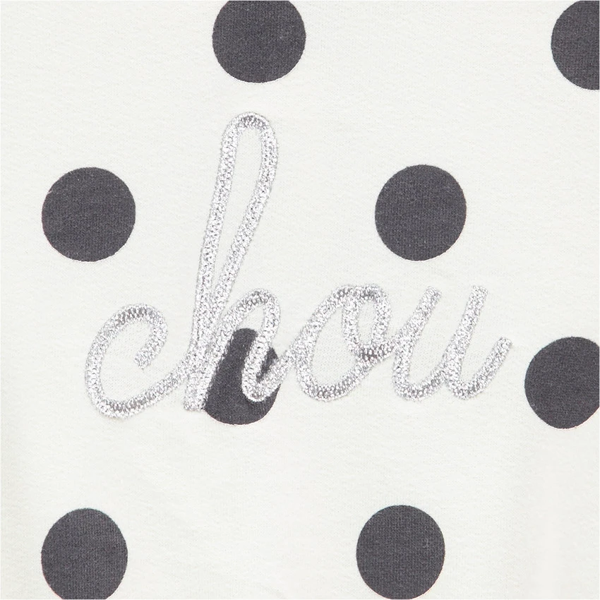 Sweat en molleton à pois. Col en maille extensible. Texte brodé argenté sur le devant. Poignets et base en maille extensible.Ouverture pressionnée au dos.