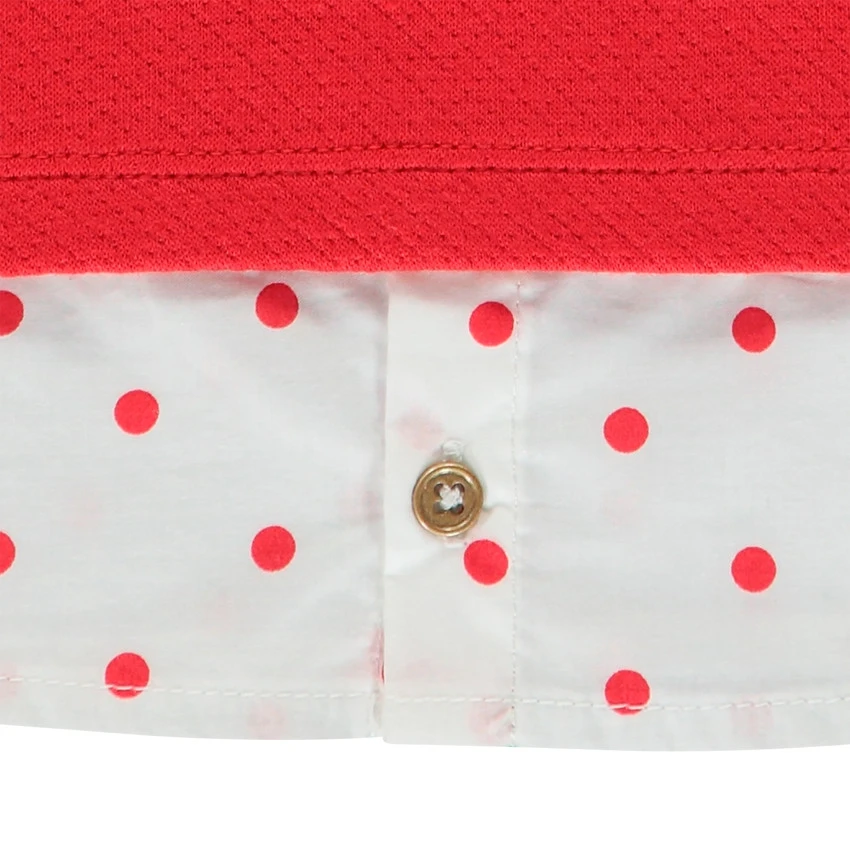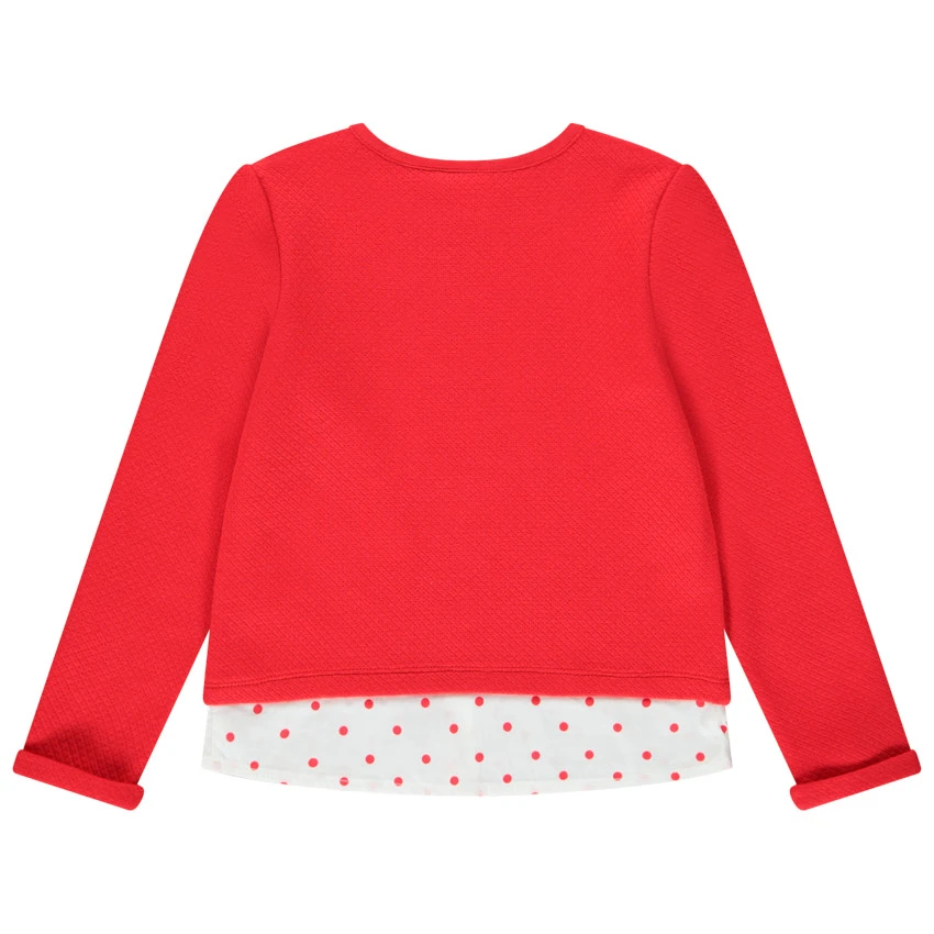 Sweat en molleton bi-matière pour fille. Effet 2 en 1. Col rond en maille extensible. Minnie pailletée printée devant. Boutonnage et pois contrastés sur le bas du sweat.
