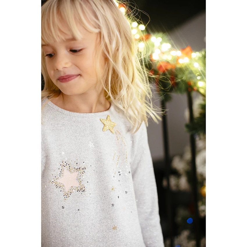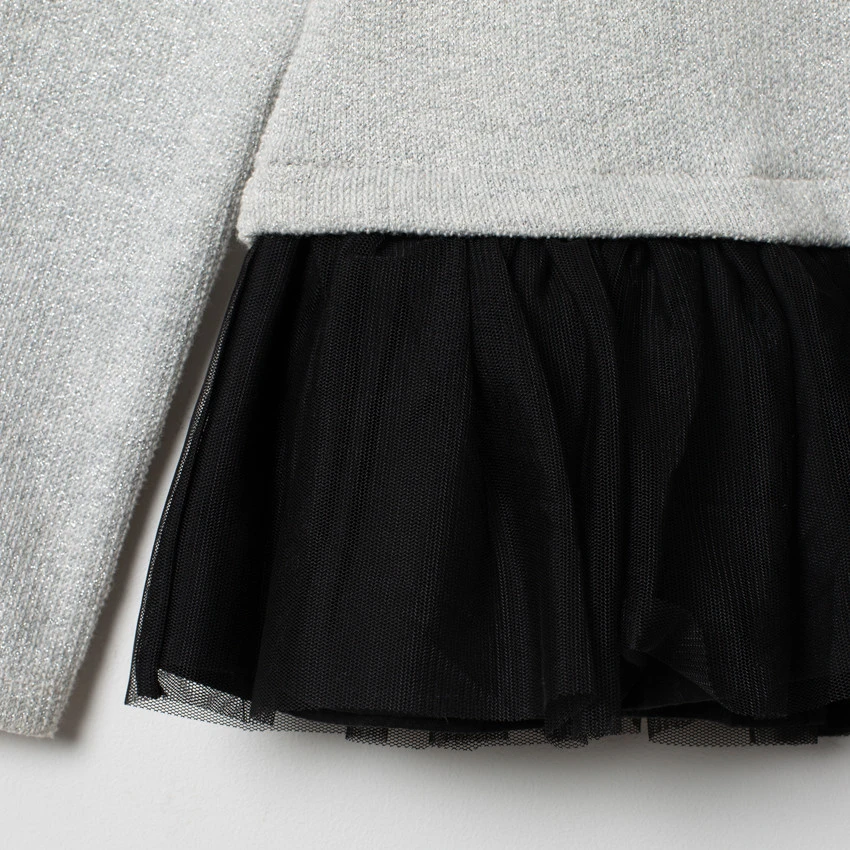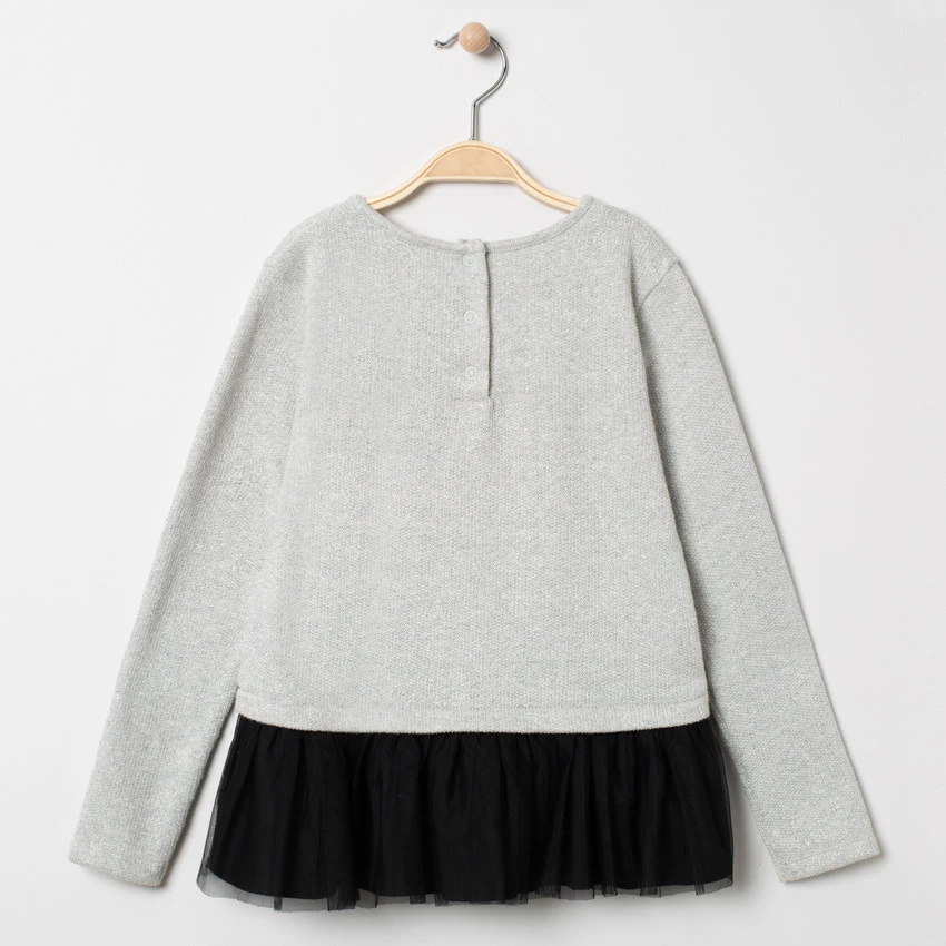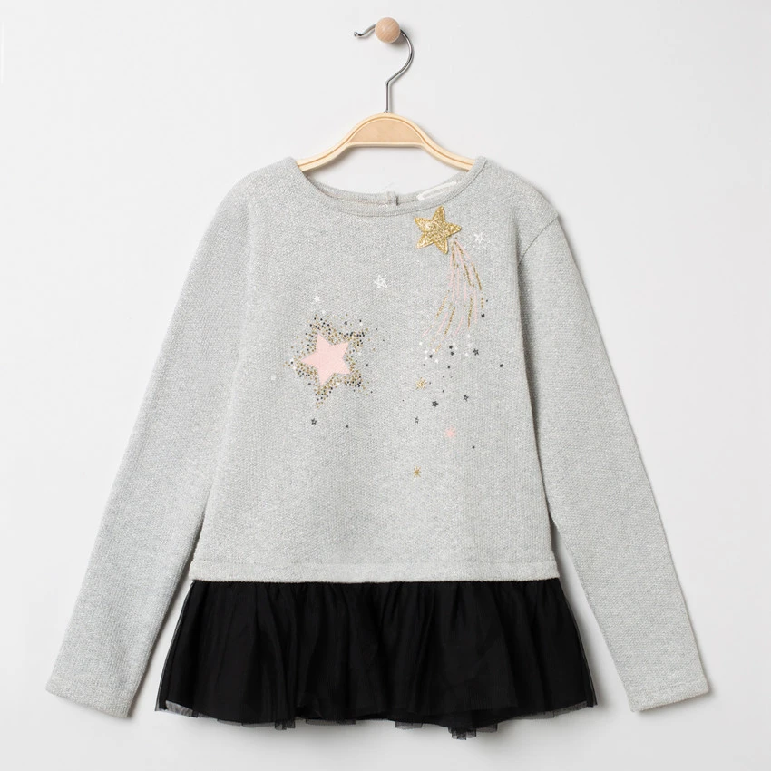 Sweat en molleton. Encolure ronde. Etoiles brillantes sur le devant. Bas du sweat en tulle volanté noir. Ouverture boutonnée au dos.