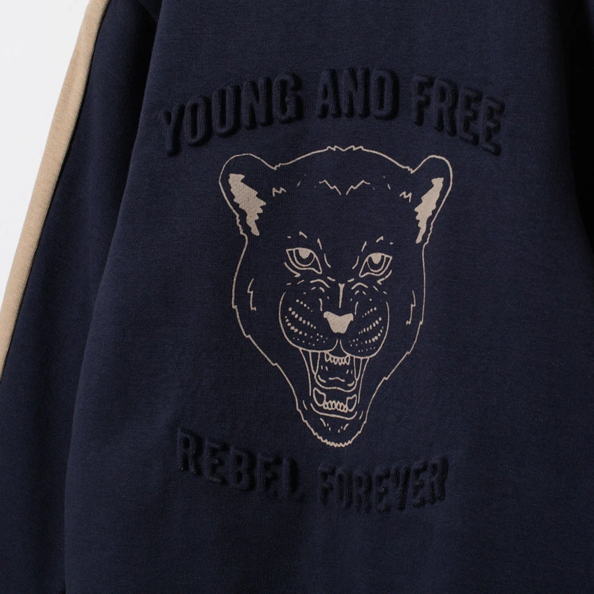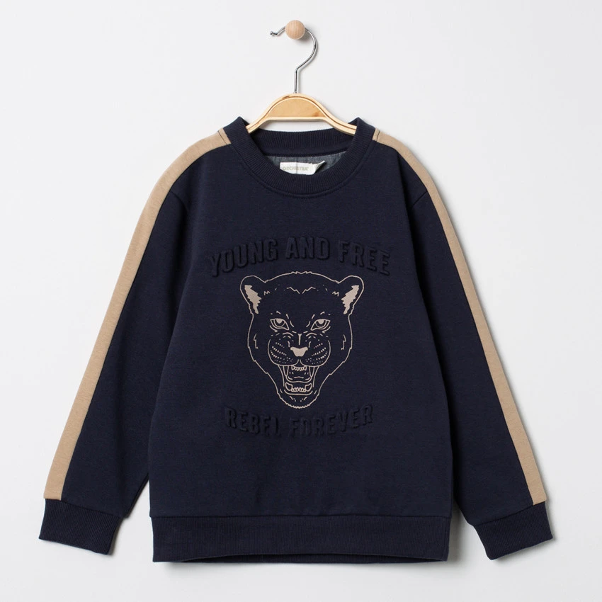 Sweat en molleton. Encolure ronde en bord-côte. Inscriptions en relief. Tête de tigre sur le devant. Bandes sur les manches. Poignets et base en bord-côte. Dos uni.