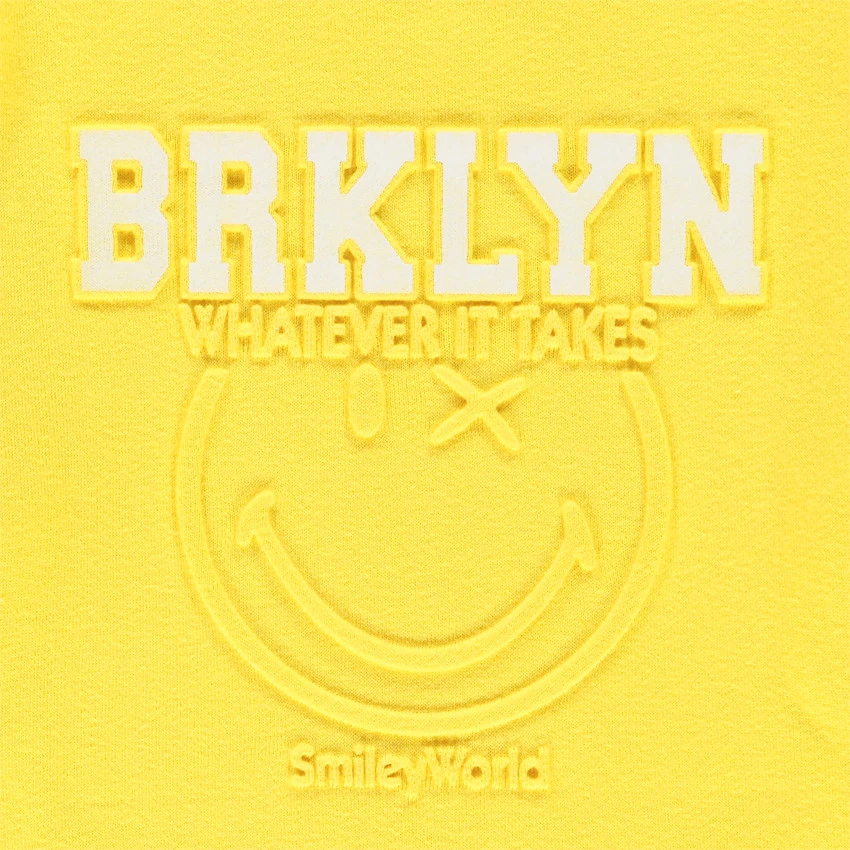Sweat en molleton jaune. Col rond en maille extensible. Inscription et SmileyWorld en embossed. Poignets et base en maille extensible. Dos uni.