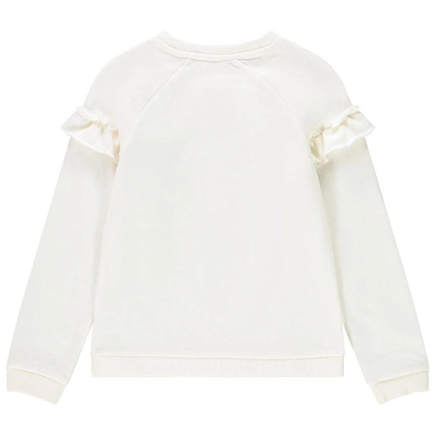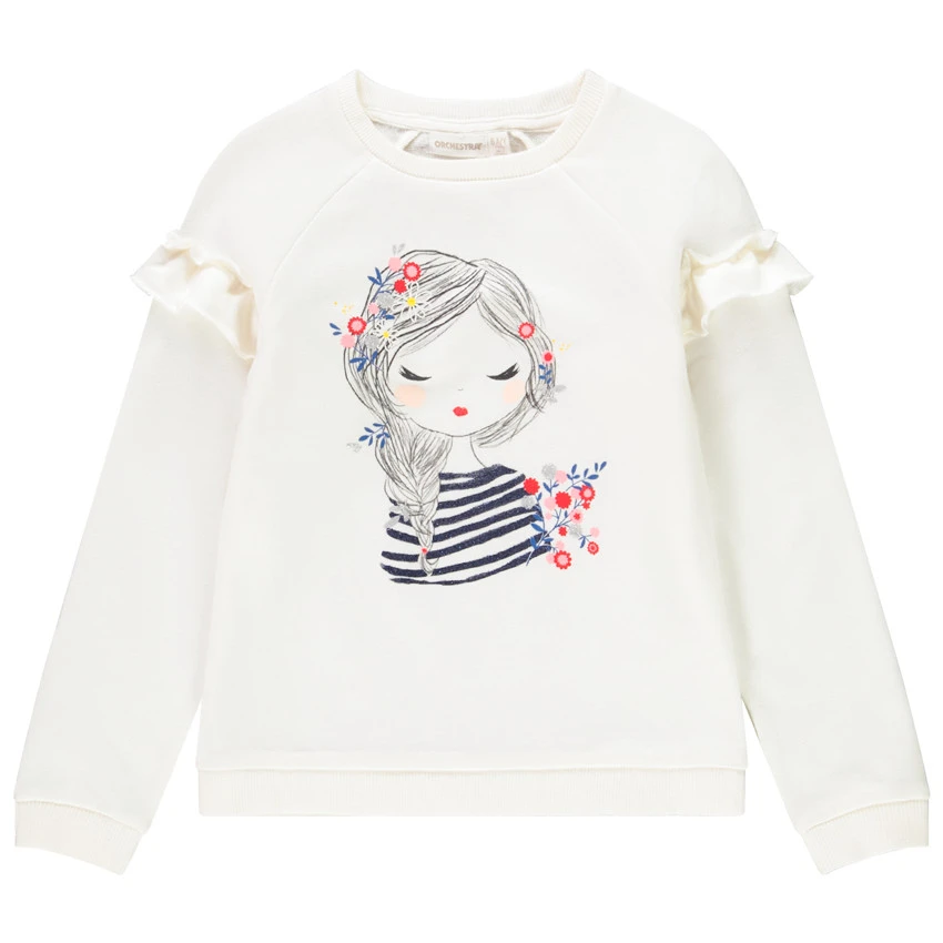 Sweat en molleton léger. Col rond en maille extensible. Manches raglan pour l’enfiler facilement et avoir plus de liberté de mouvements. Volants sur les emmanchures. Personnage printé devant. Poignets et base en maille extensible. Dos uni.