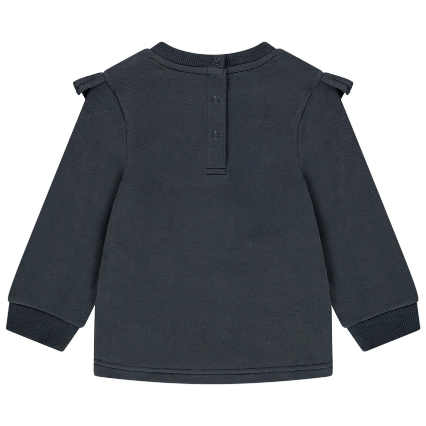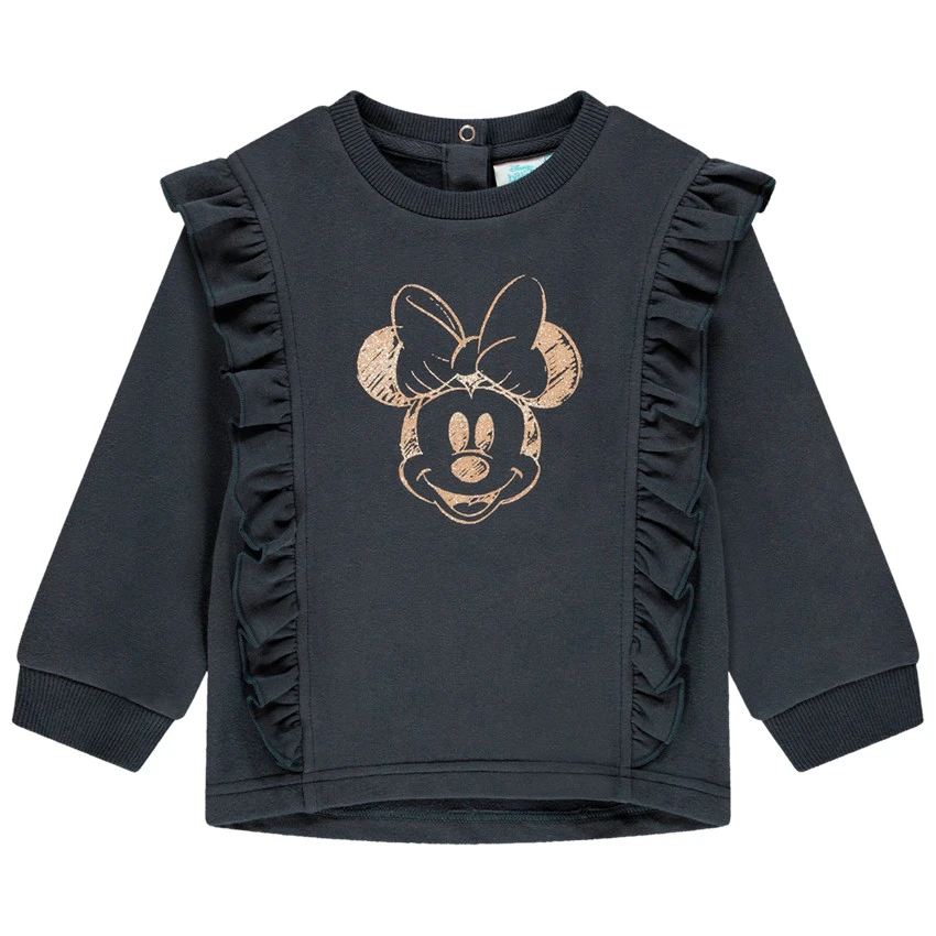 Sweat en molleton uni. Col rond en maille extensible. Volants sur le devant. Minnie printée devant. Ouverture pressionnée au dos pour l’enfiler facilement. Poignets en maille extensible.
