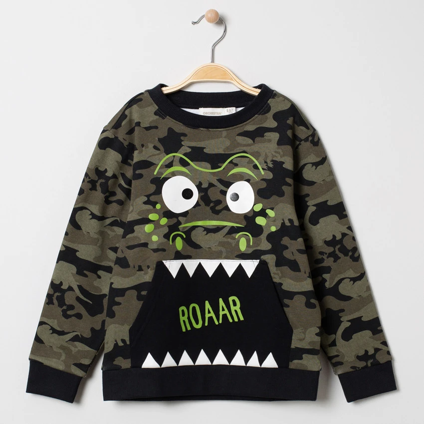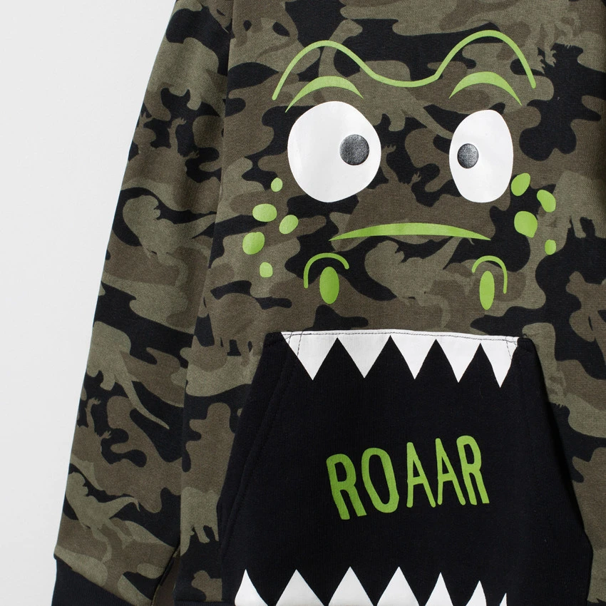 Sweat en molleton motif camouflage. Dino printé devant. 1 poche kangourou imprimée.