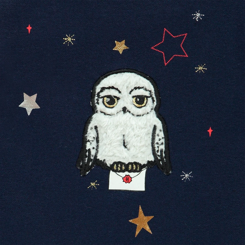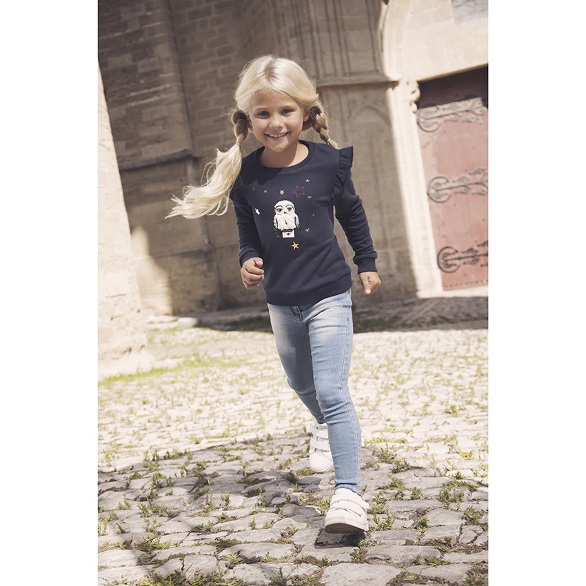 Sweat en molleton pour enfant fille. Col en maille extensible. Chouette en sherpa brodée devant et étoiles printées. Volants sur les emmanchures. Poignets et base en maille extensible. Dos uni.