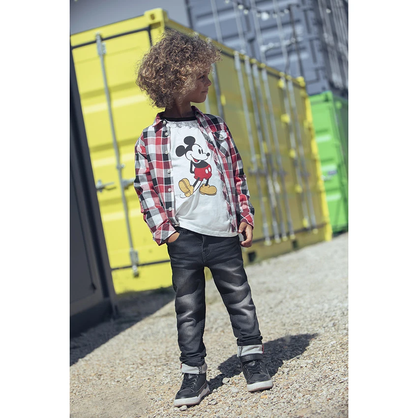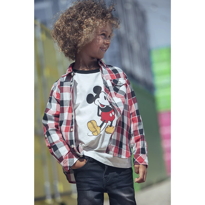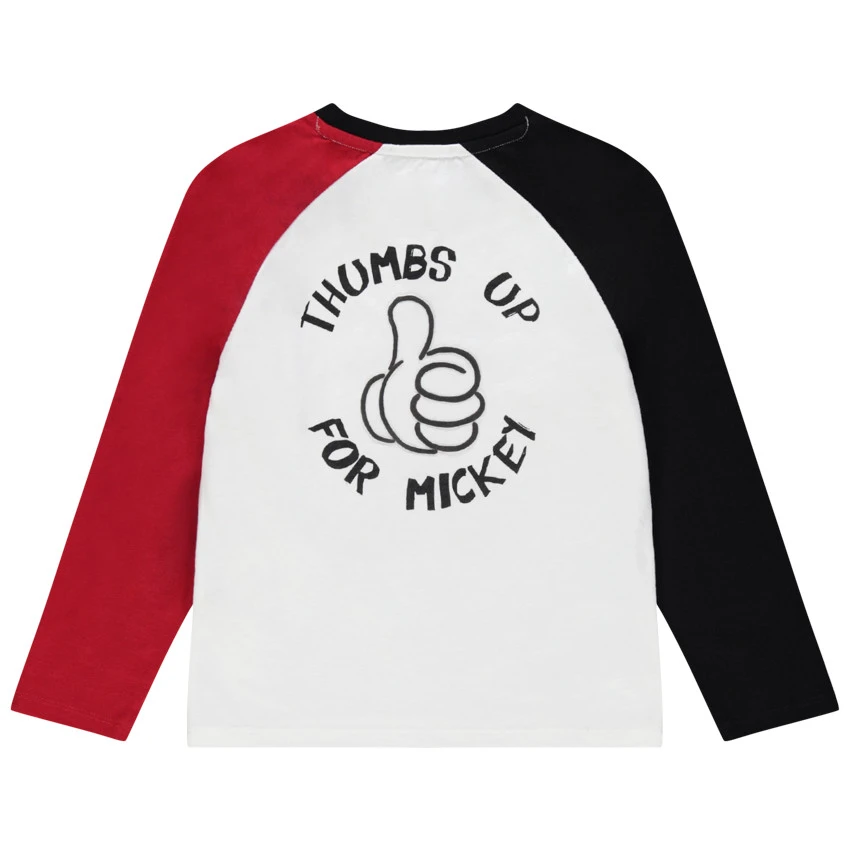 T-shirt manches longues contrastées. Encolure ronde en maille extensible. Mickey printé devant. Inscriptions et main de Mickey en contraste au dos.