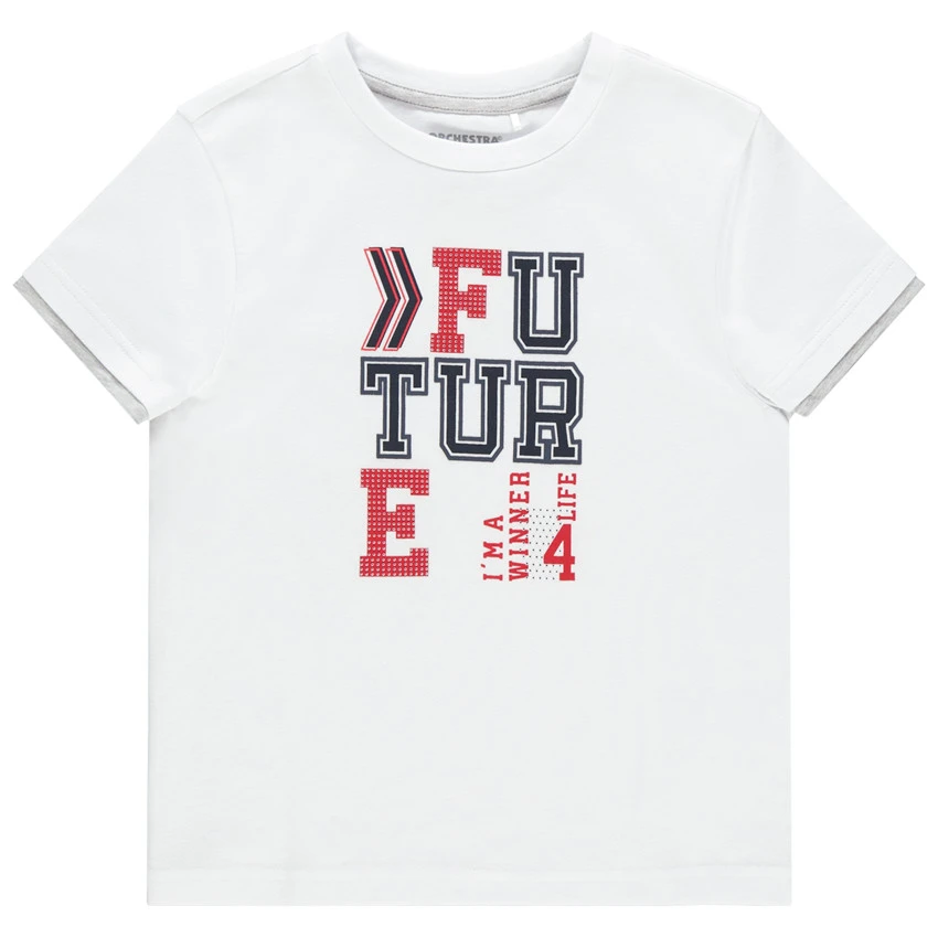 T-shirt manches courtes uni. Encolure ronde en bord-côte. Message printé sur le devant. Dos uni.