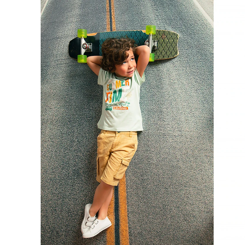 T-shirt manches courtes. Encolure ronde en bord côte. Patch « Summer time » appliqué sur le devant. Dos uni.