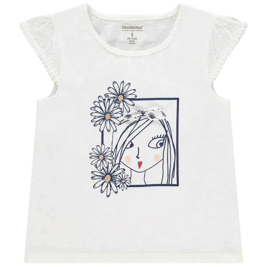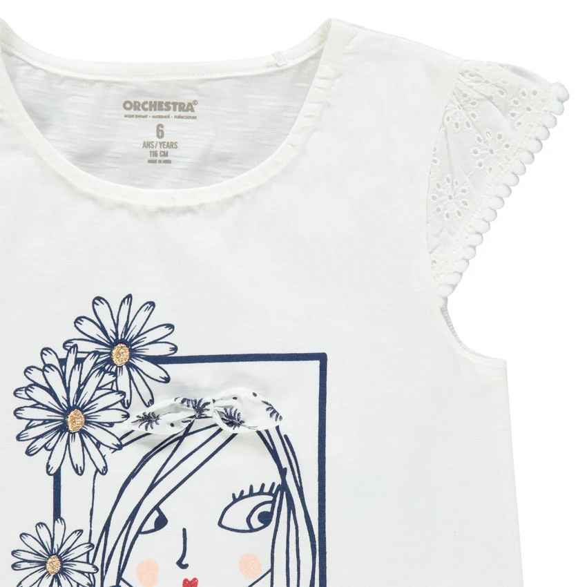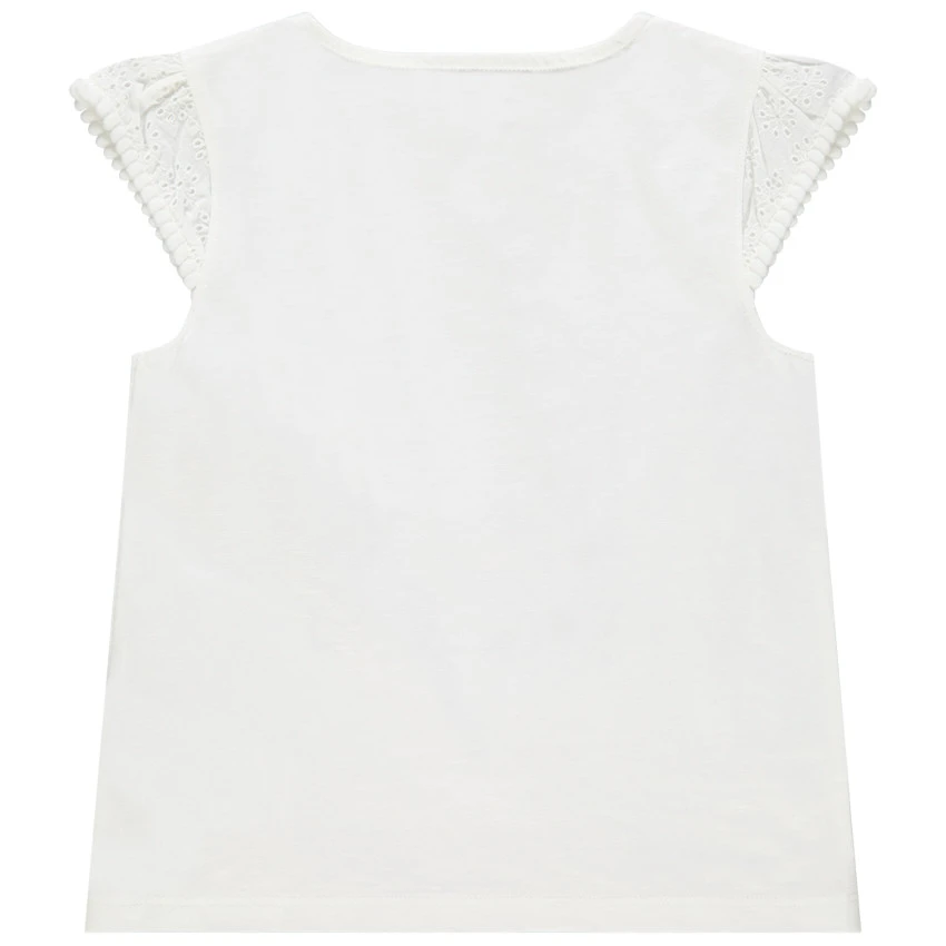 T-shirt à manches courtes en borderie anglaise. Encolure ronde en bord-côte. Personnage printé devant avec noeud en relief. Dos uni.