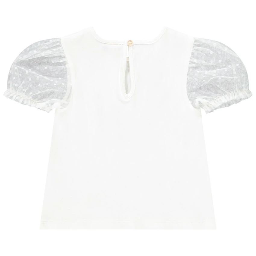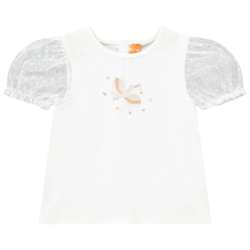 T-shirt manches courtes élastiquées en tulle. Encolure ronde. Print cigogne sur le devant avec détails brillants. Ouverture fantaisie boutonnée dans le dos.