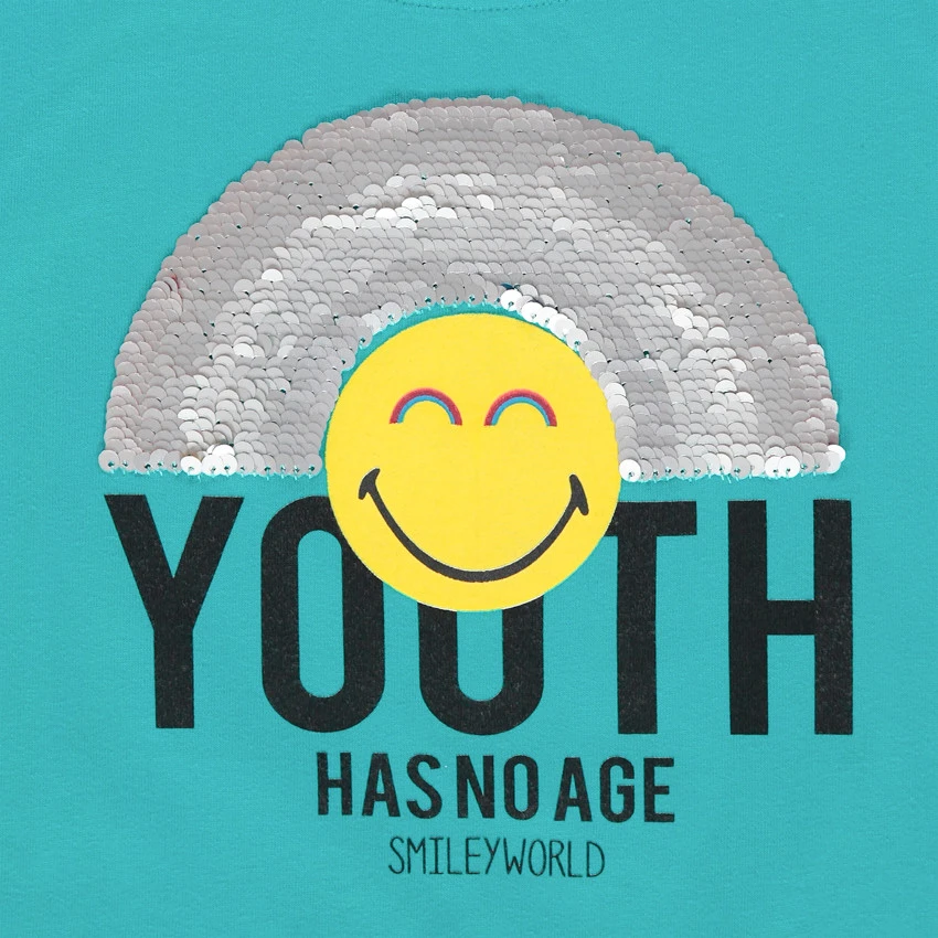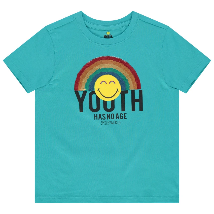 T-shirt manches courtes en coton issu de lâagriculture biologique. Encolure ronde en bord-cĂŽte. SmileyWorld et arc-en-ciel en sequins magiques. Dos uni.