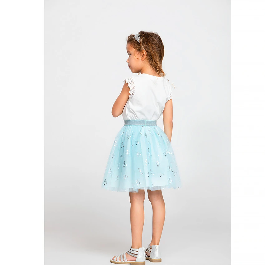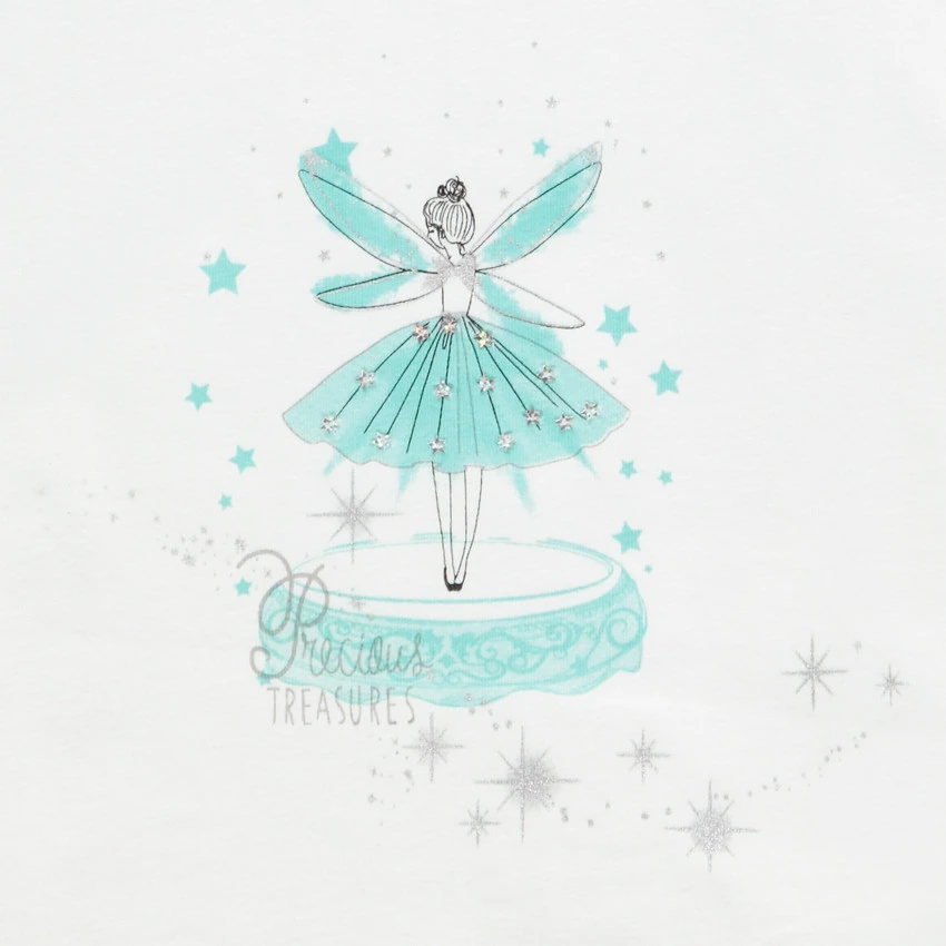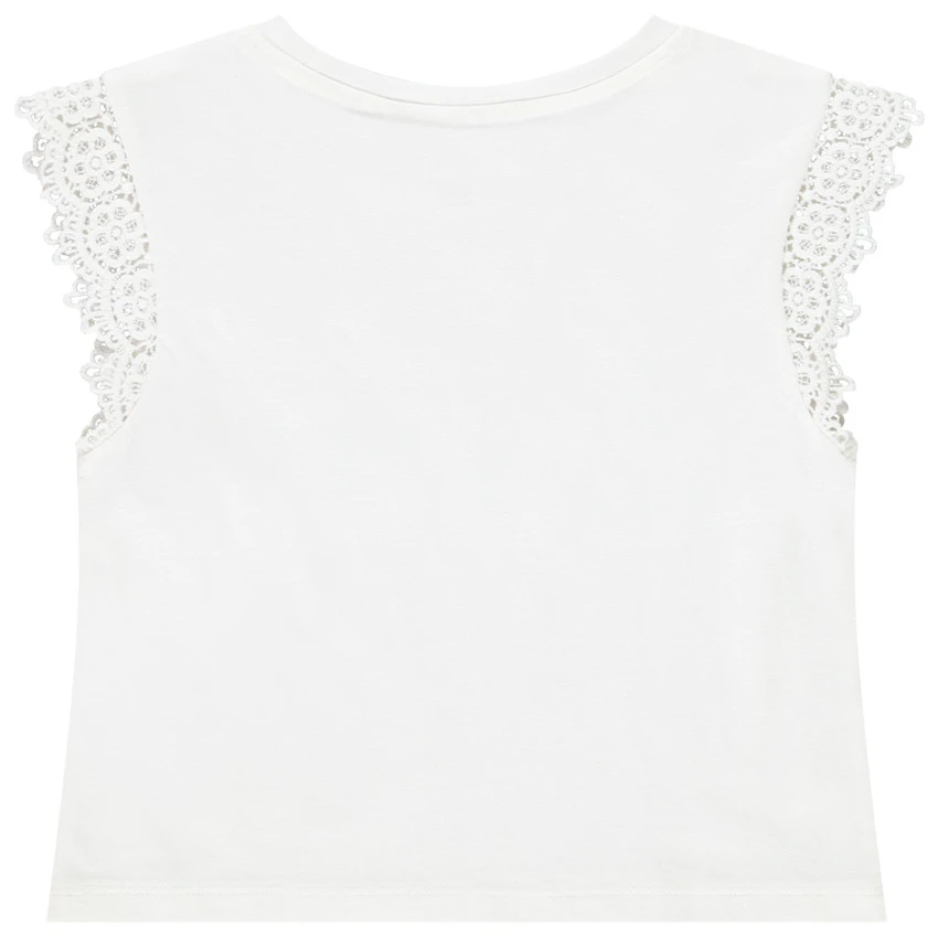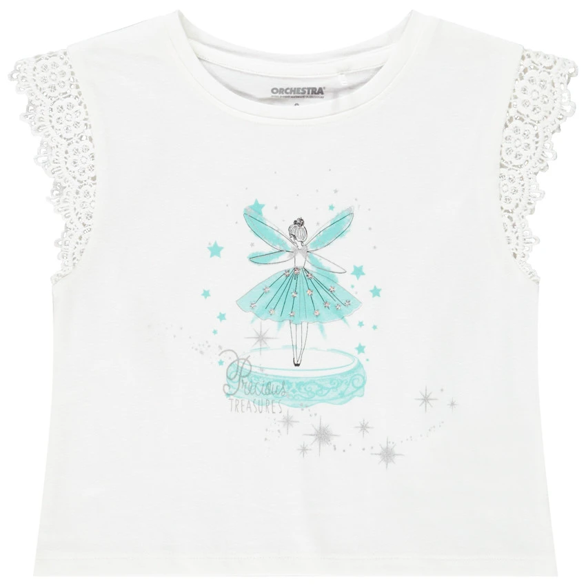 T-shirt manches courtes. Encolure ronde en bord côte. Manches courtes avec dentelle. Print fée et détails brillants sur le devant. Dos uni.