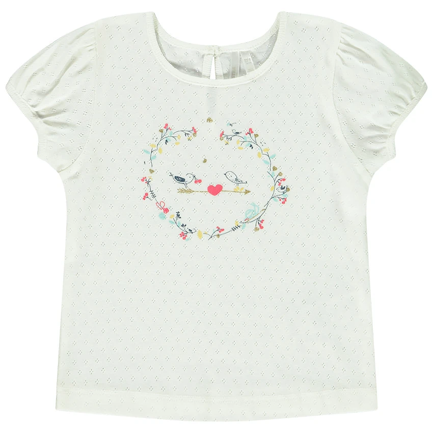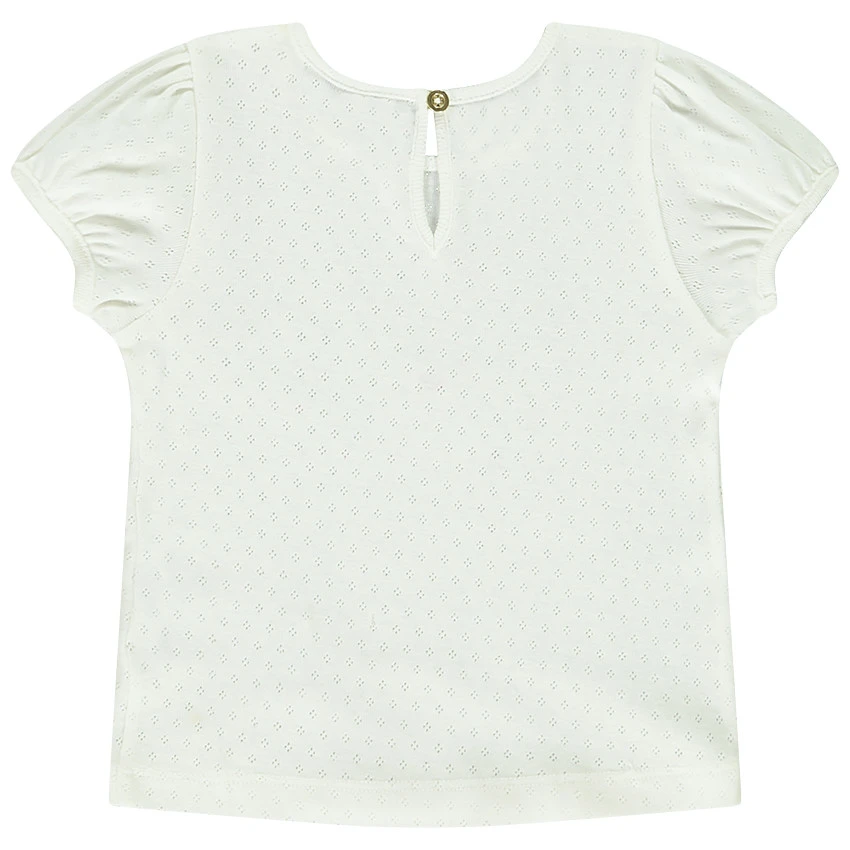 T-shirt à manches courtes élastiquées. Encolure ronde. Print sur le devant. Ouverture fantaisie boutonnée dans le dos. Maille pointelle.