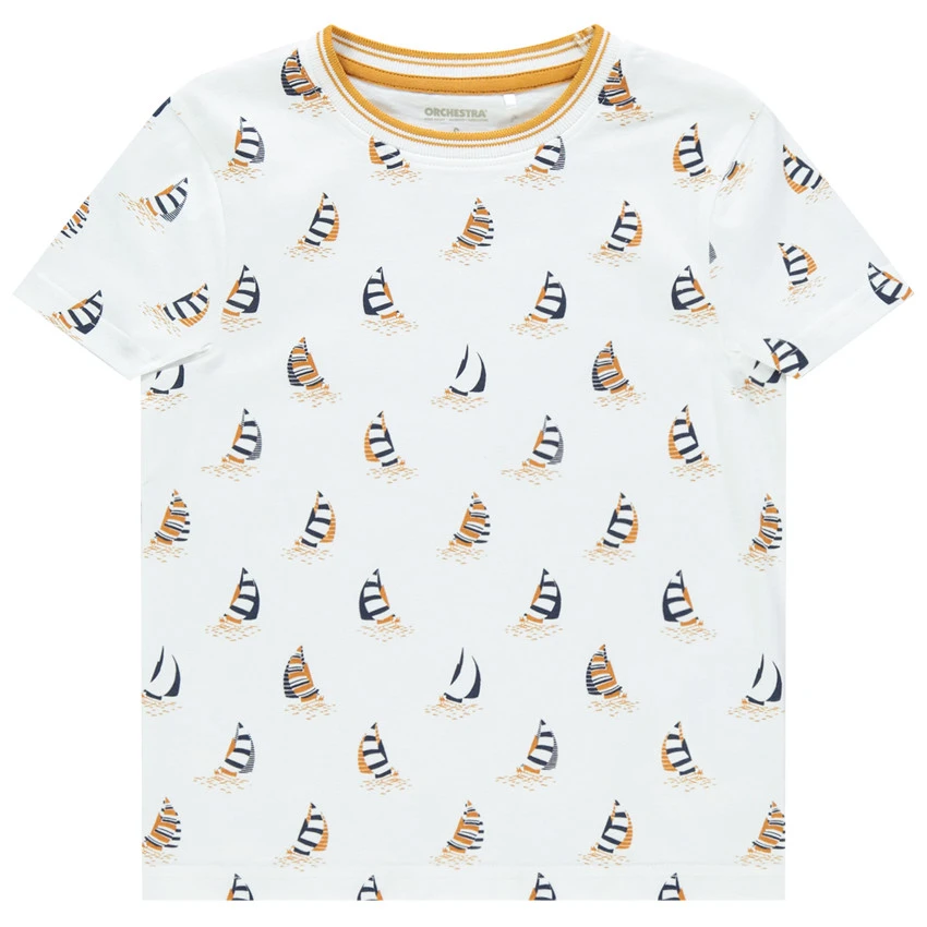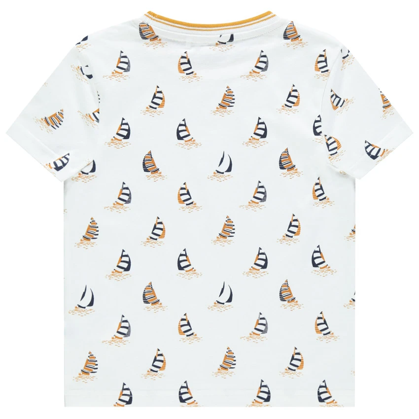 T-shirt manches courtes en coton. Encolure ronde en bord-côte rayé. Bateaux printés all-over.