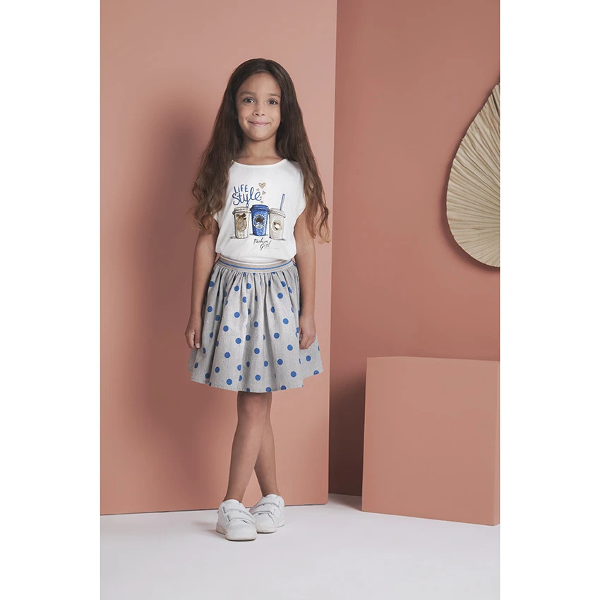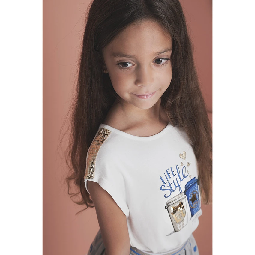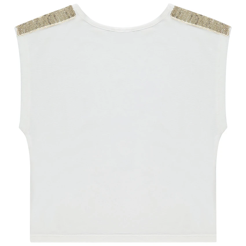 T-shirt manches courtes forme boîte. Empiècements en sequins sur les épaules. Boissons printées, texte et sequins sur le devant. Dos uni.