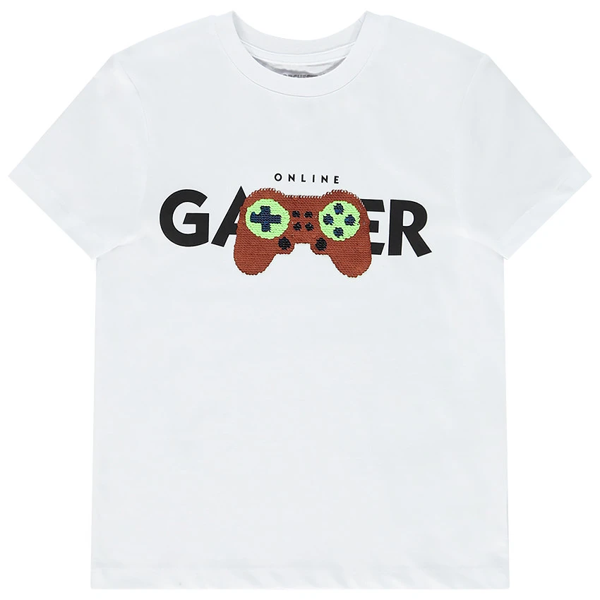 T-shirt manches courtes. Encolure ronde en bord côte. Print « Online gamer » et manette de jeu en sequins magiques sur le devant. Dos uni.