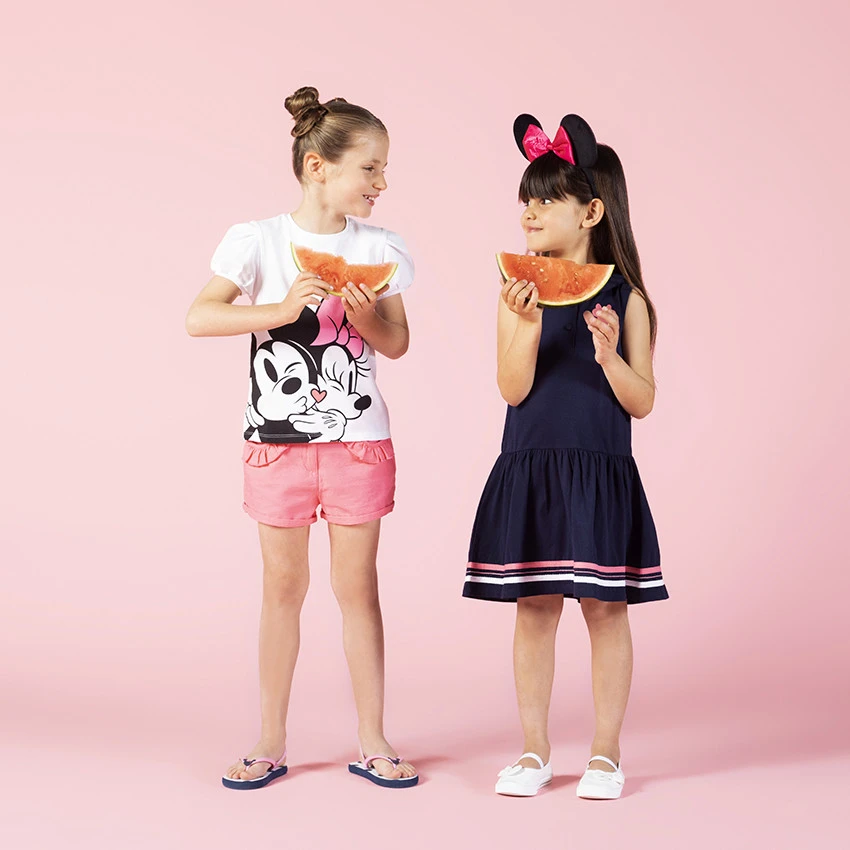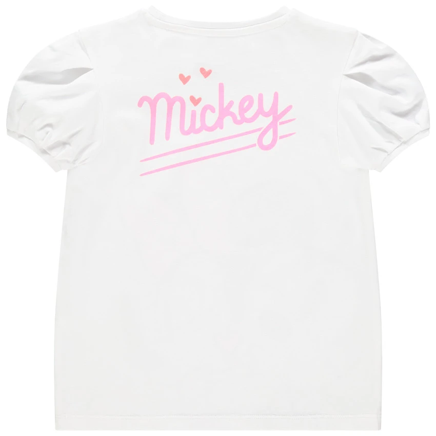 T-shirt manches courtes en coton. Encolure ronde en bord-côte. Print Mickey et Minnie sur le devant. Dos uni avec inscription printée pailletée.