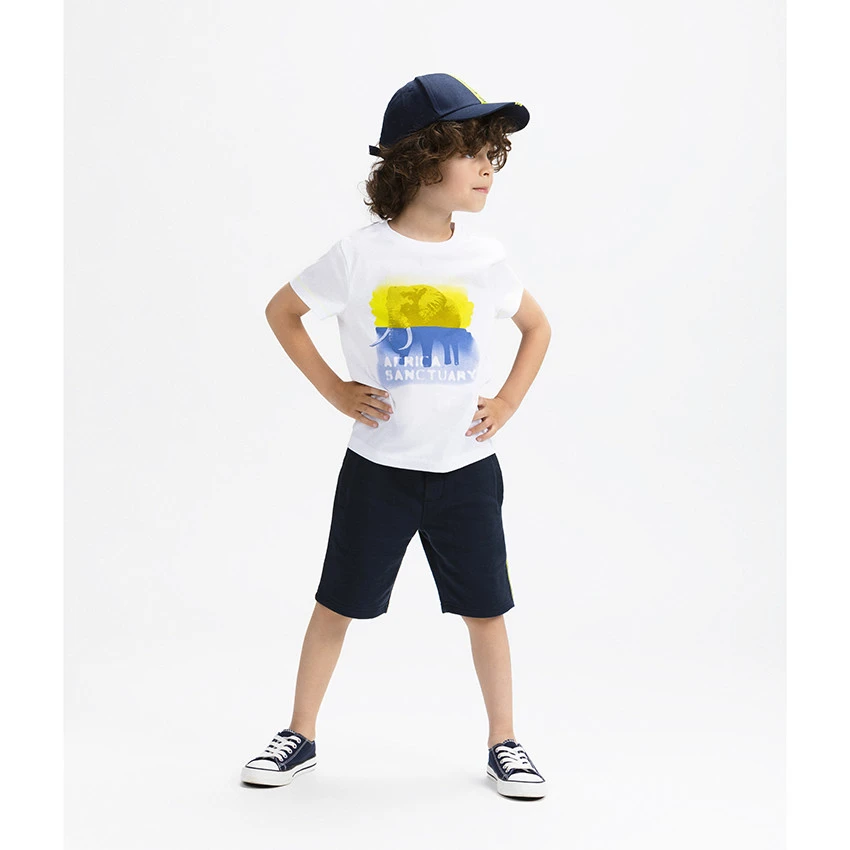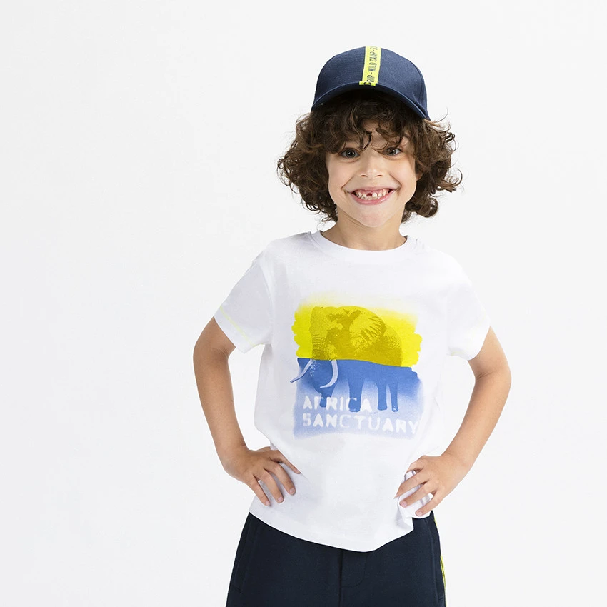 T-shirt manches courtes tombantes avec surpiqûres contrastées. Encolure ronde en bord côte. Visuel photoprint sur le devant. Dos uni.