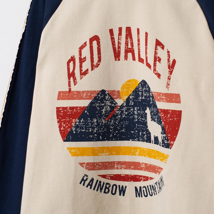 T-shirt à manches longues contrastées. Encolure ronde en bord-côte. Bandes contrastées sur les manches. Motif printé devant. Manches raglan pour plus de liberté de mouvement.