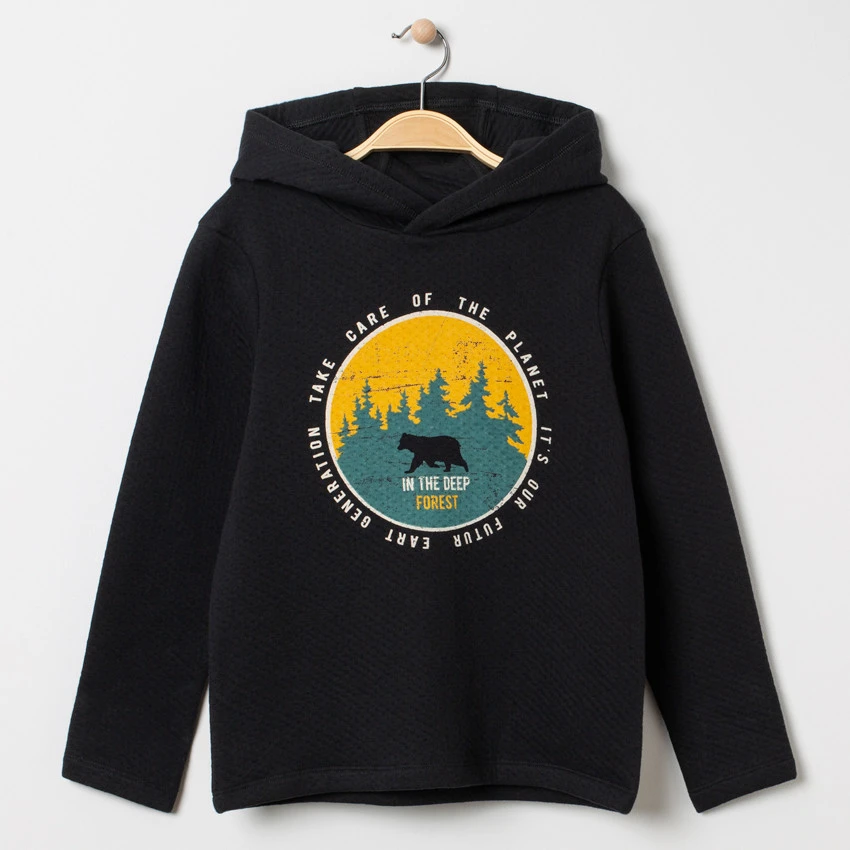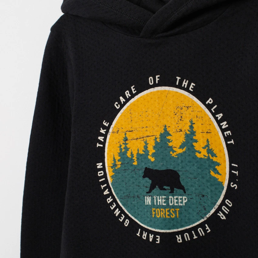 T-shirt à capuche en maille fantaisie. Print esprit forêt sur le devant. Dos uni.