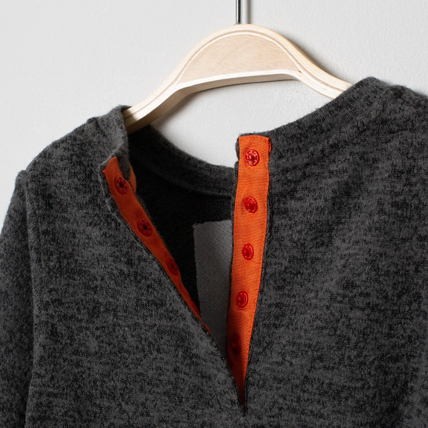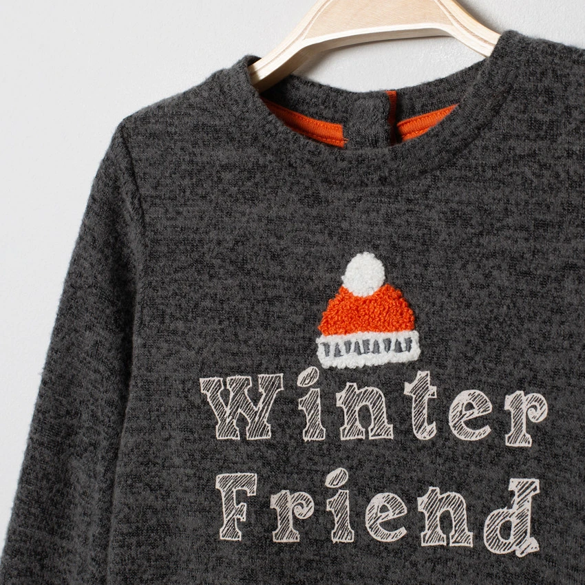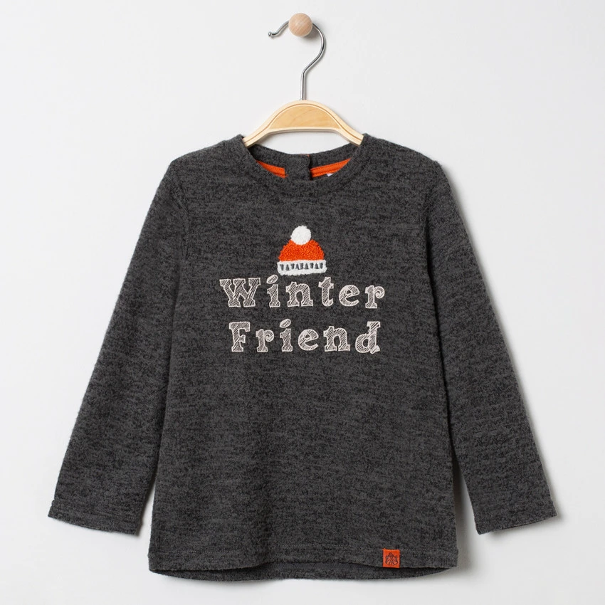 T-shirt manches longues en maille twistée. Encolure ronde en bord-côte. Message printé devant avec détail en bouclette. Ouverture pressionnée au dos.