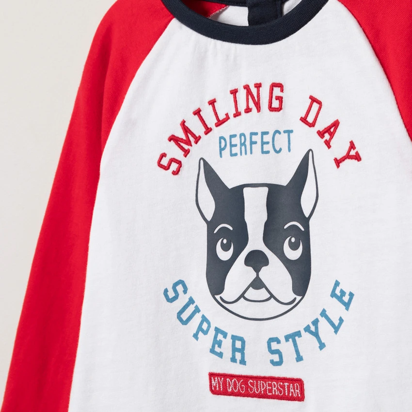 T-shirt manches longues bicolore. Encolure ronde en bord-côte contrasté. Bouledogue français printé devant. Ouverture pressionnée au dos.