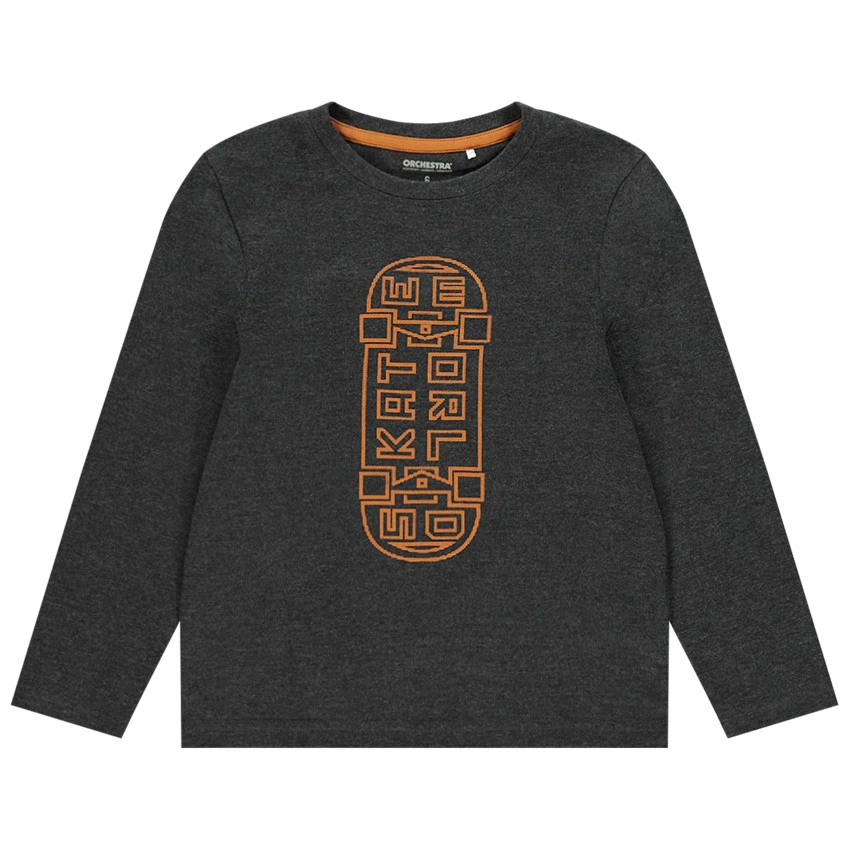 T-shirt manches longues chiné. Encolure ronde en bord-côte avec biais contrasté à l’intérieur. Skateboard contrasté printé devant. Dos uni.