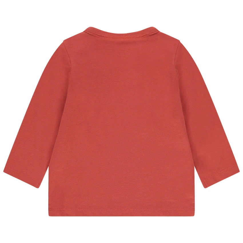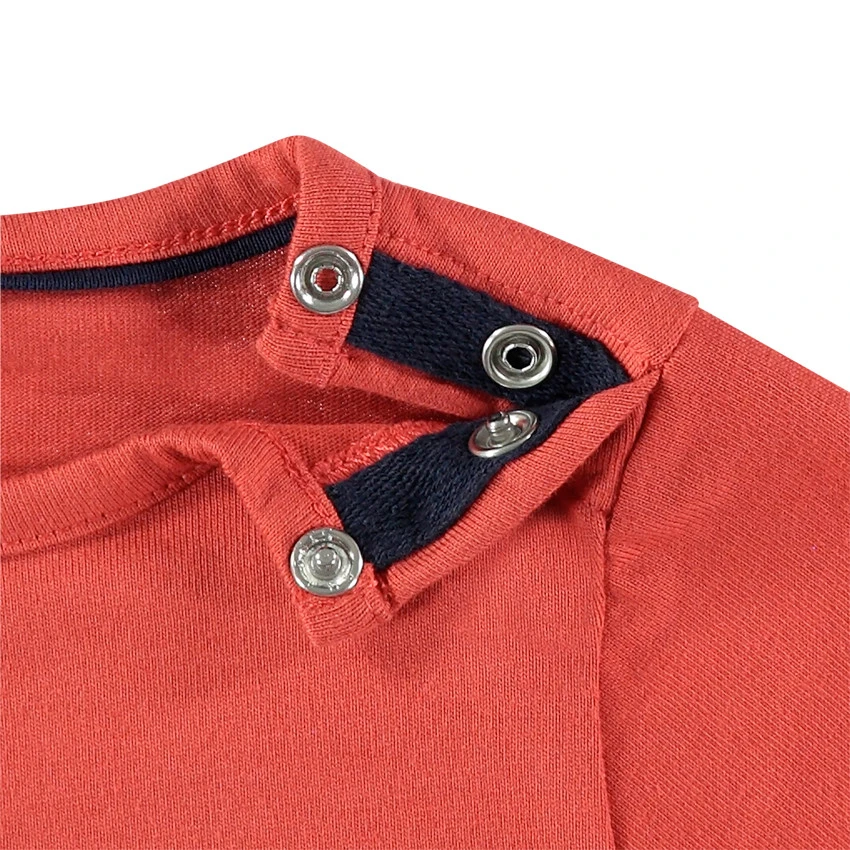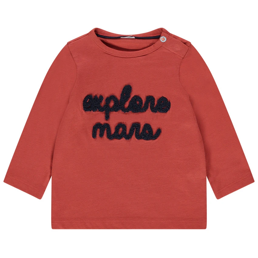 T-shirt manches longues en coton bio. Encolure ronde en bord-côte. Ouverture pressionnée sur le côté du col. Inscription en bouclette sur le devant. Dos uni.