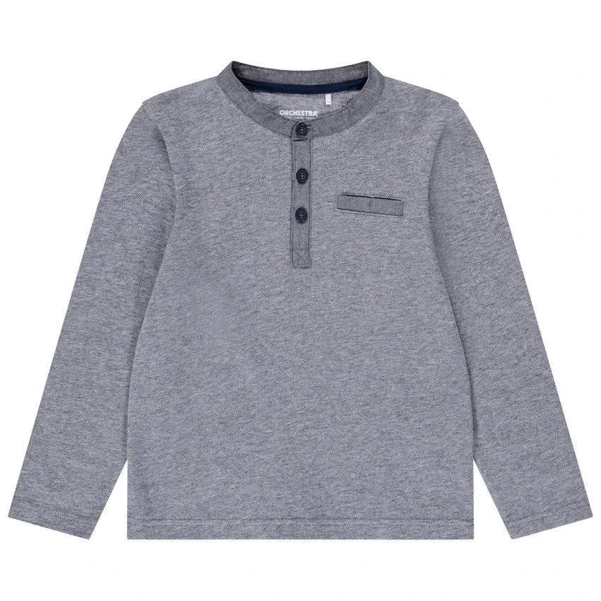 T-shirt manches longues en maille piquée. Col rond boutonné sur le devant pour faciliter le passage de la tête. 1 poche passepoilée sur la poitrine.