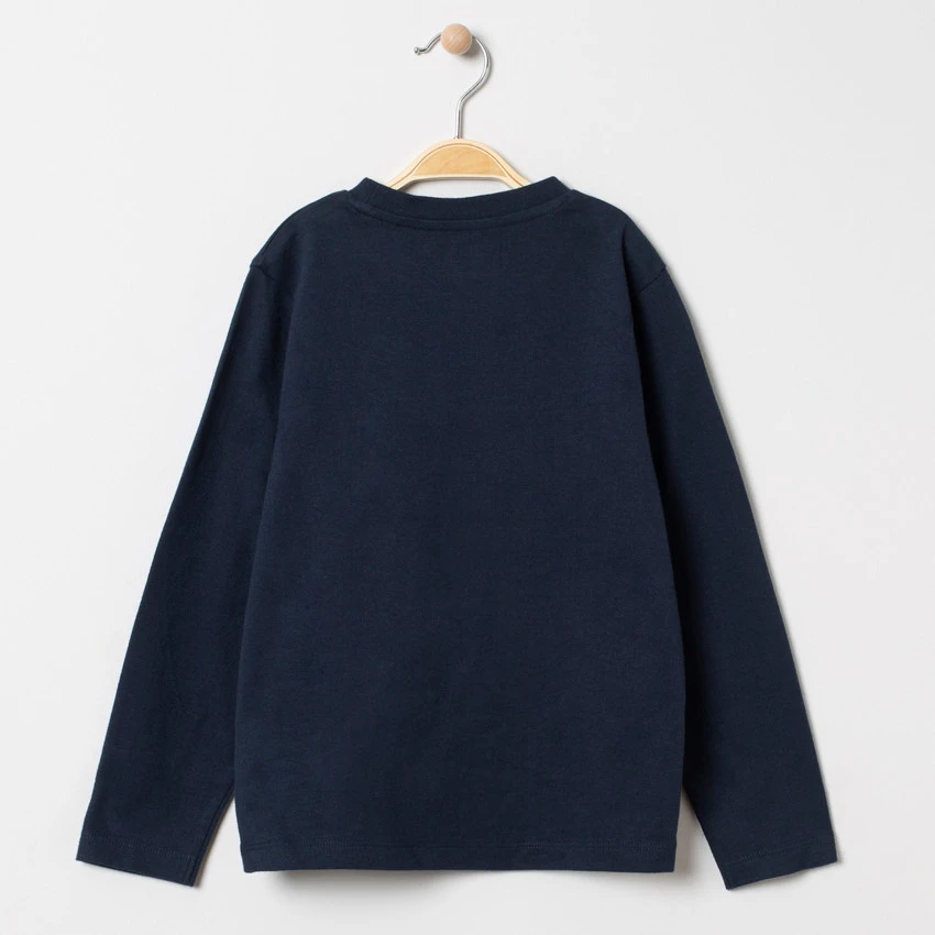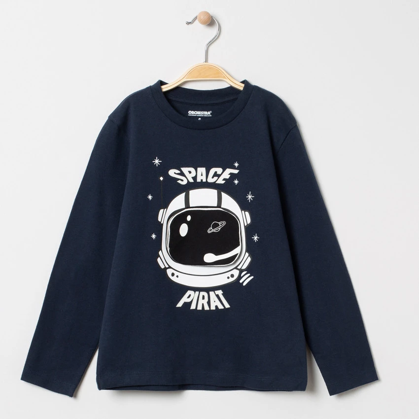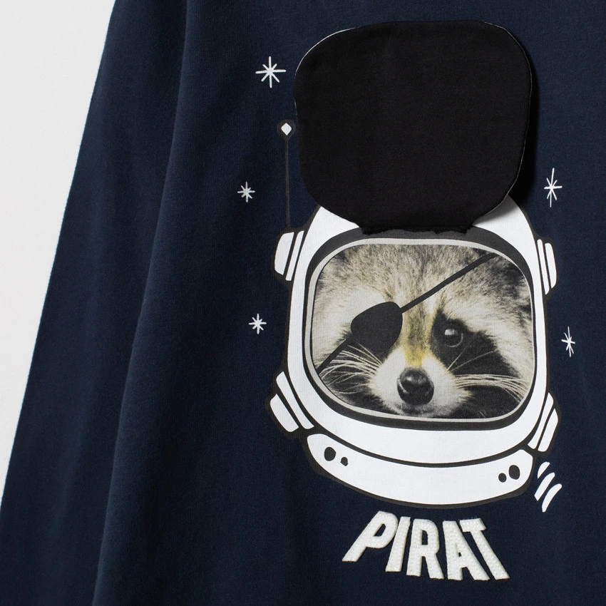 T-shirt manches longues en coton bio. Encolure ronde en bord-côte. Cosmonaute avec rabat mobile et raton laveur printé en dessous. Dos uni.
