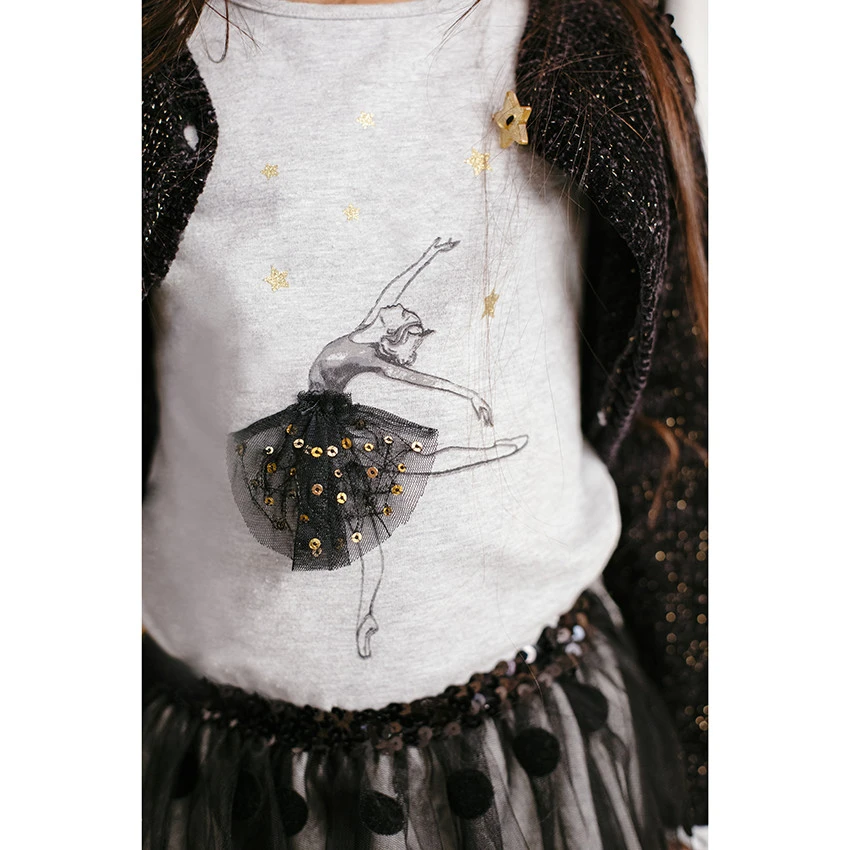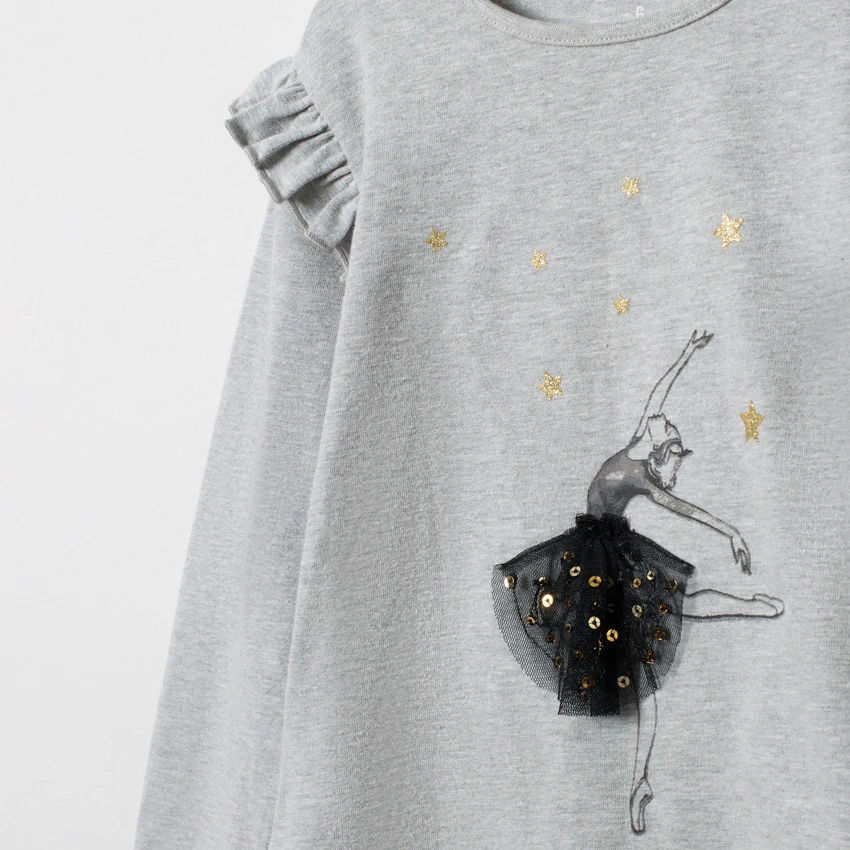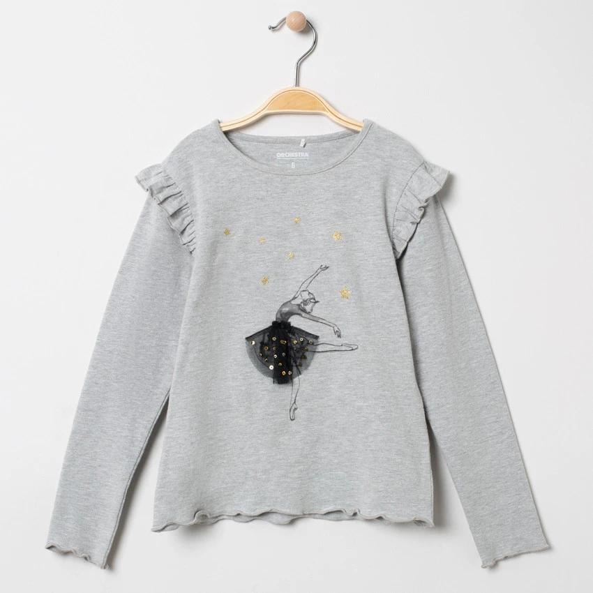 T-shirt manches longues chiné. Encolure ronde en bord-côte. Volants sur les emmanchures. Etoiles dorées printées avec danseuse et jupon en tulle à sequins. Dos uni.