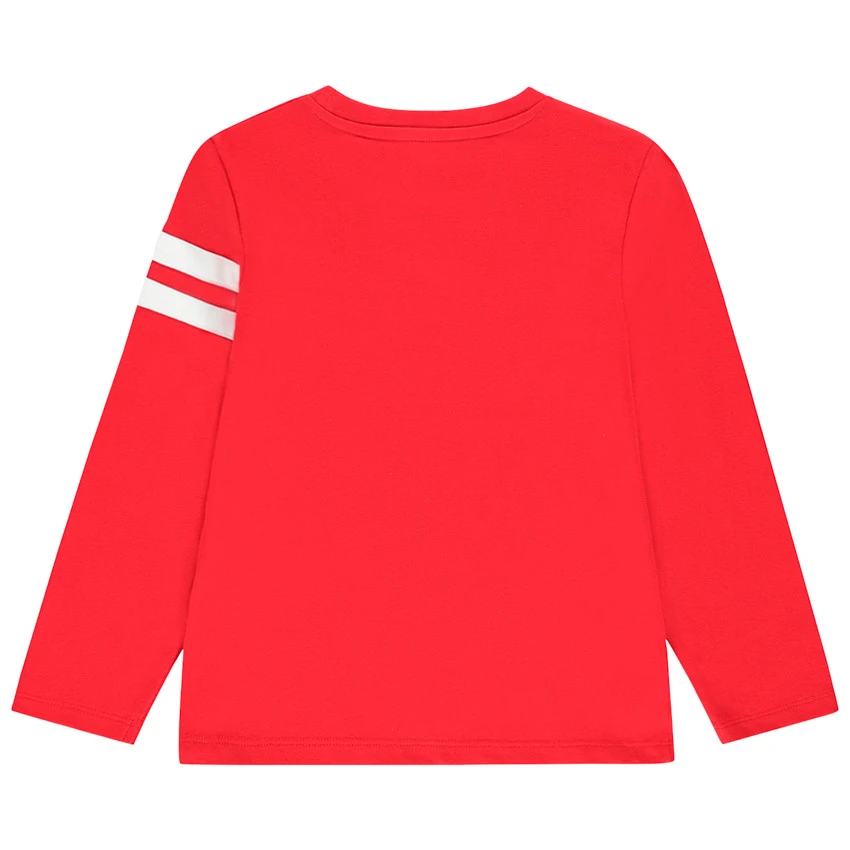 T-shirt manches longues en coton rouge. Col rond en maille extensible. Bandes contrastées sur la manche gauche. Donald printé sur le devant. Dos uni.