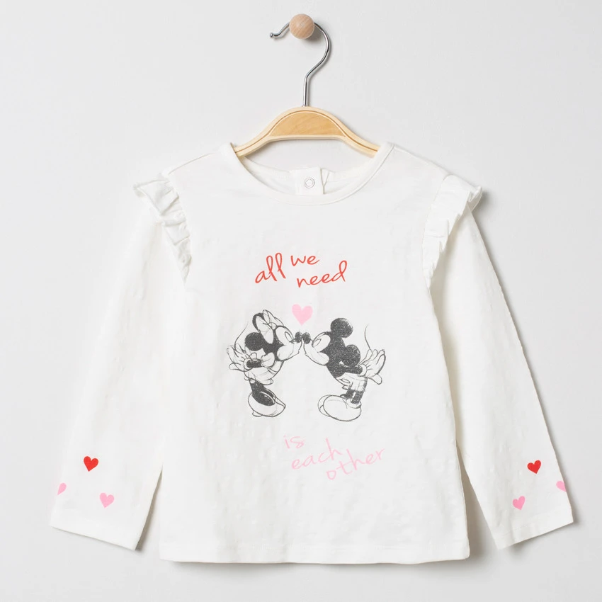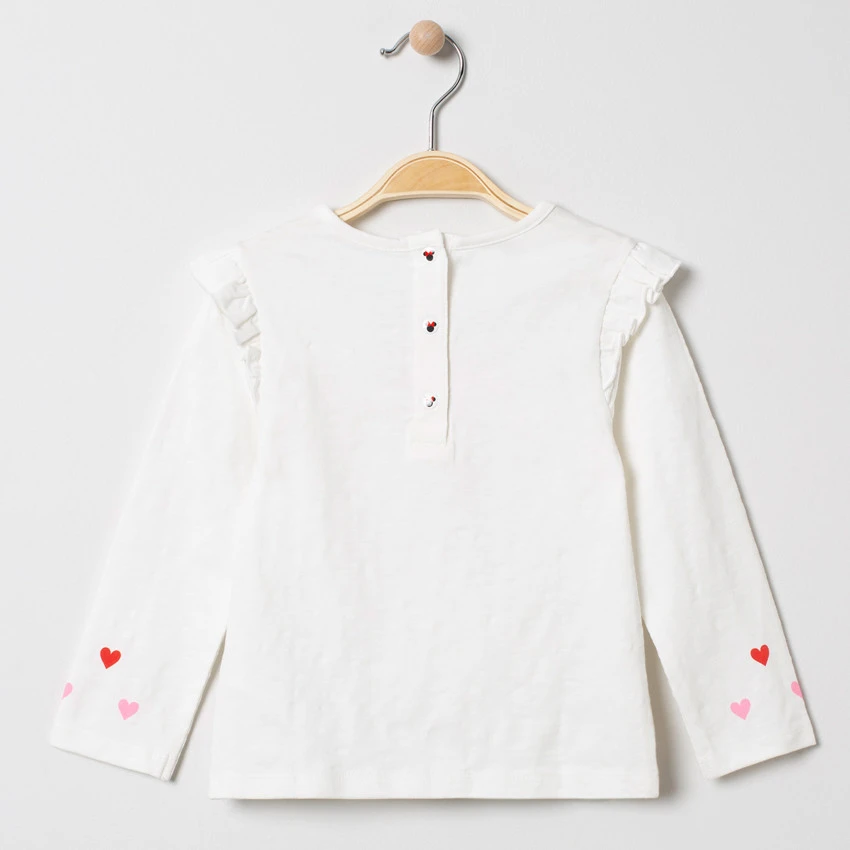 T-shirt manches longues uni. Encolure ronde. Volants sur les manches. Mickey et Minnie printés devant. Coeurs printés sur le bout des manches. Ouverture pressionnée au dos.