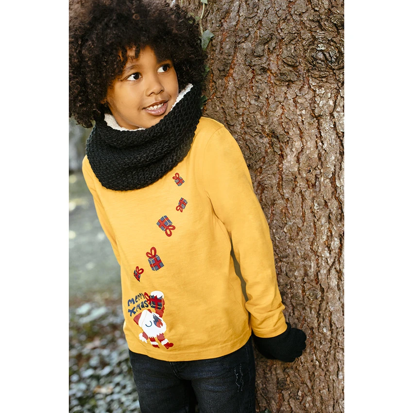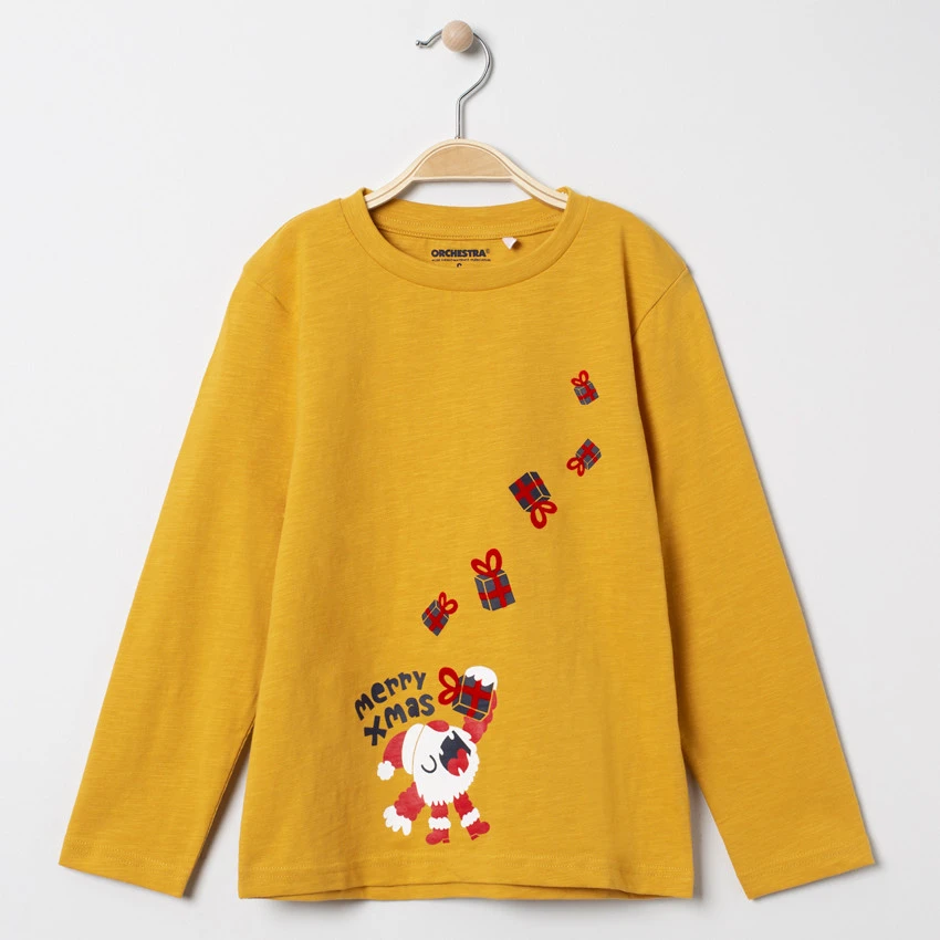 T-shirt manches longues chiné. Encolure ronde en bord-côte. Monstre Père Noël printé devant avec cadeaux. Dos uni.