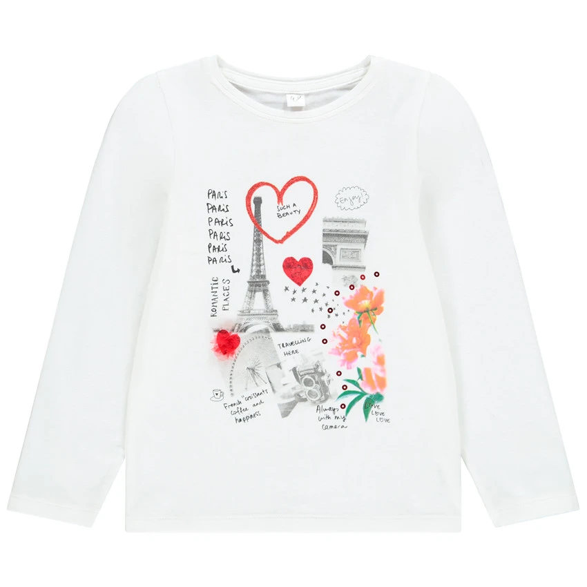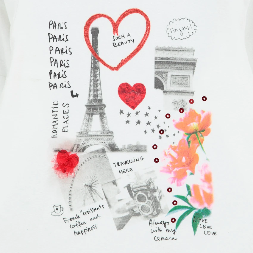 T-shirt manches longues en coton. Col rond en maille extensible pour l’enfiler facilement. Print Paris sur le devant avec tulle et coeur pailleté. Sequins cousus. Dos uni.