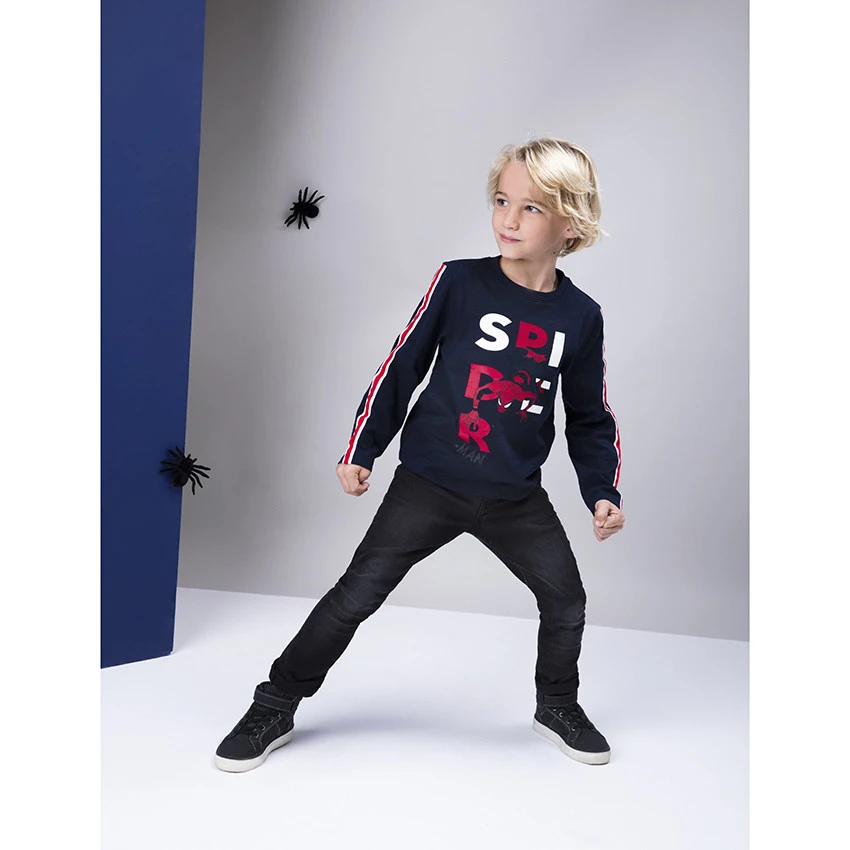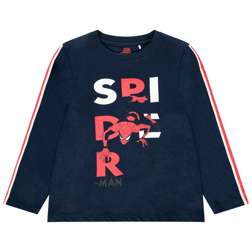 T-shirt manches longues bleu marine. Col en maille extensible. Spider-Man printé devant. Bandes sur les manches. Dos uni.